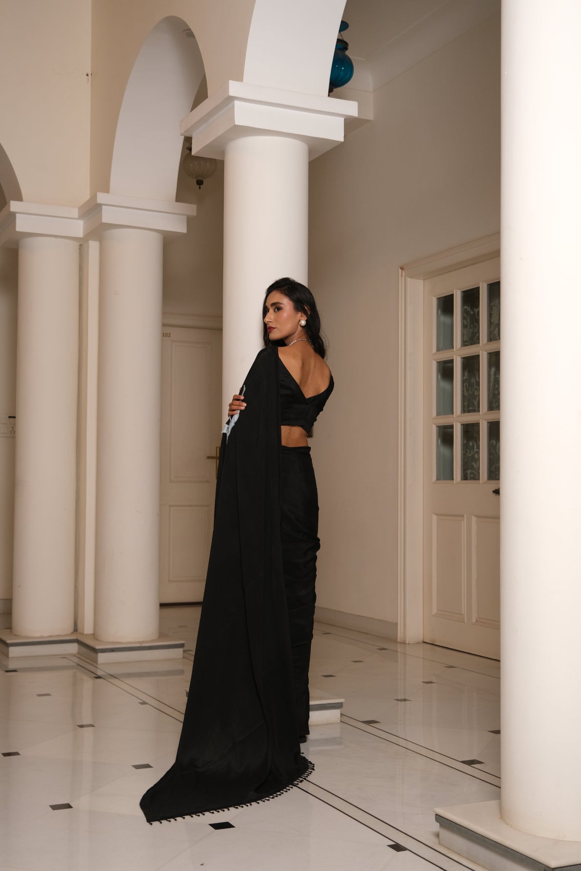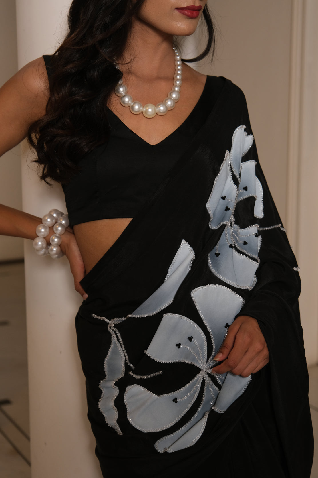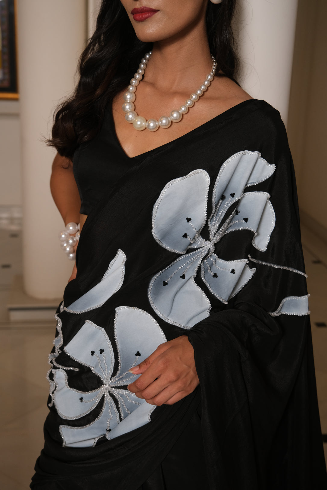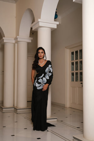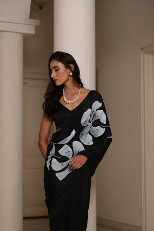 The Shanti Saree is a statement of elegance in black crepe, adorned with huge hand-painted florals in soft hues. Its fluid drape and striking artwork make it perfect for evening occasions. Paired with a black blouse, this saree blends traditional grace with contemporary artistry, creating a timeless silhouette.