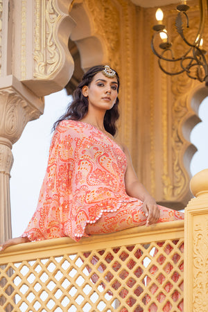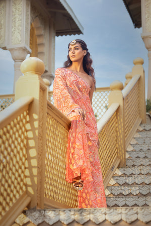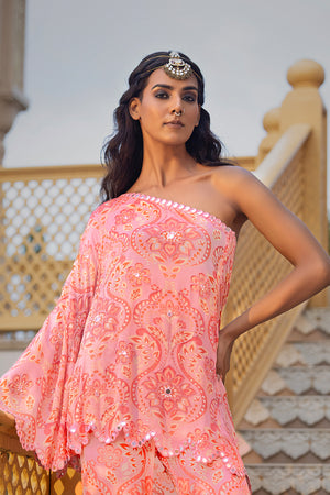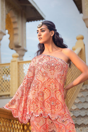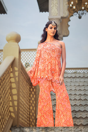For the bride who enters the room like a celebration, this rose-hued printed crepe ensemble from Sajeda Lehry’s RAANGBAAZ collection brings together elegance, energy, and unmistakable flair. The one-shoulder top features a scalloped edge hand-embroidered with mirror work — catching the sangeet lights with every turn — and is covered in delicate mirror detailing that shimmers like a secret shared mid-dance. It’s paired with matching printed crepe sharara pants that move with grace and drama, rustling like the soft sound of whispered gossip and golden laughter. This is bridal wear for the ones who choose sparkle over silence, rhythm over restraint.