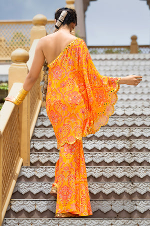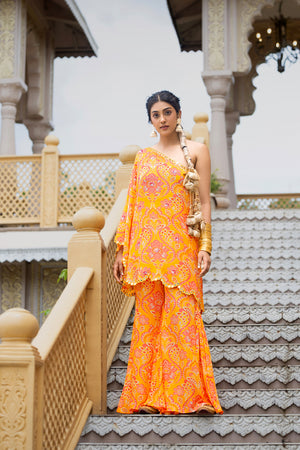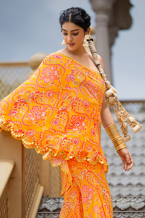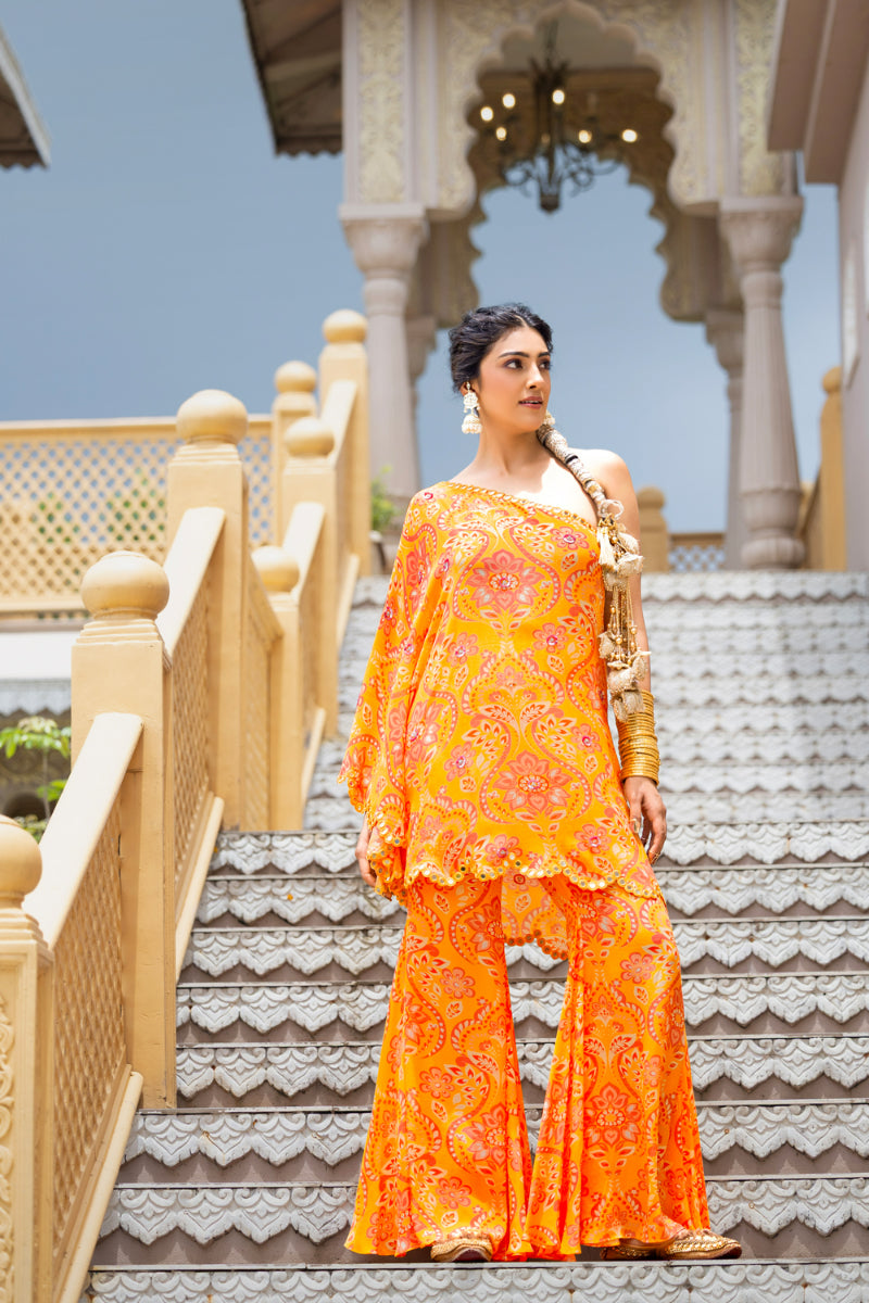 For the bride who enters the room like a celebration, this yellow printed crepe ensemble from Sajeda Lehry’s RAANGBAAZ collection brings together elegance, energy, and unmistakable flair. The one-shoulder top features a scalloped edge hand-embroidered with mirror work — catching the sangeet lights with every turn — and is covered in delicate mirror detailing that shimmers like a secret shared mid-dance. It’s paired with matching printed crepe sharara pants that move with grace and drama, rustling like the soft sound of whispered gossip and golden laughter. This is bridal wear for the ones who choose sparkle over silence, rhythm over restraint.
