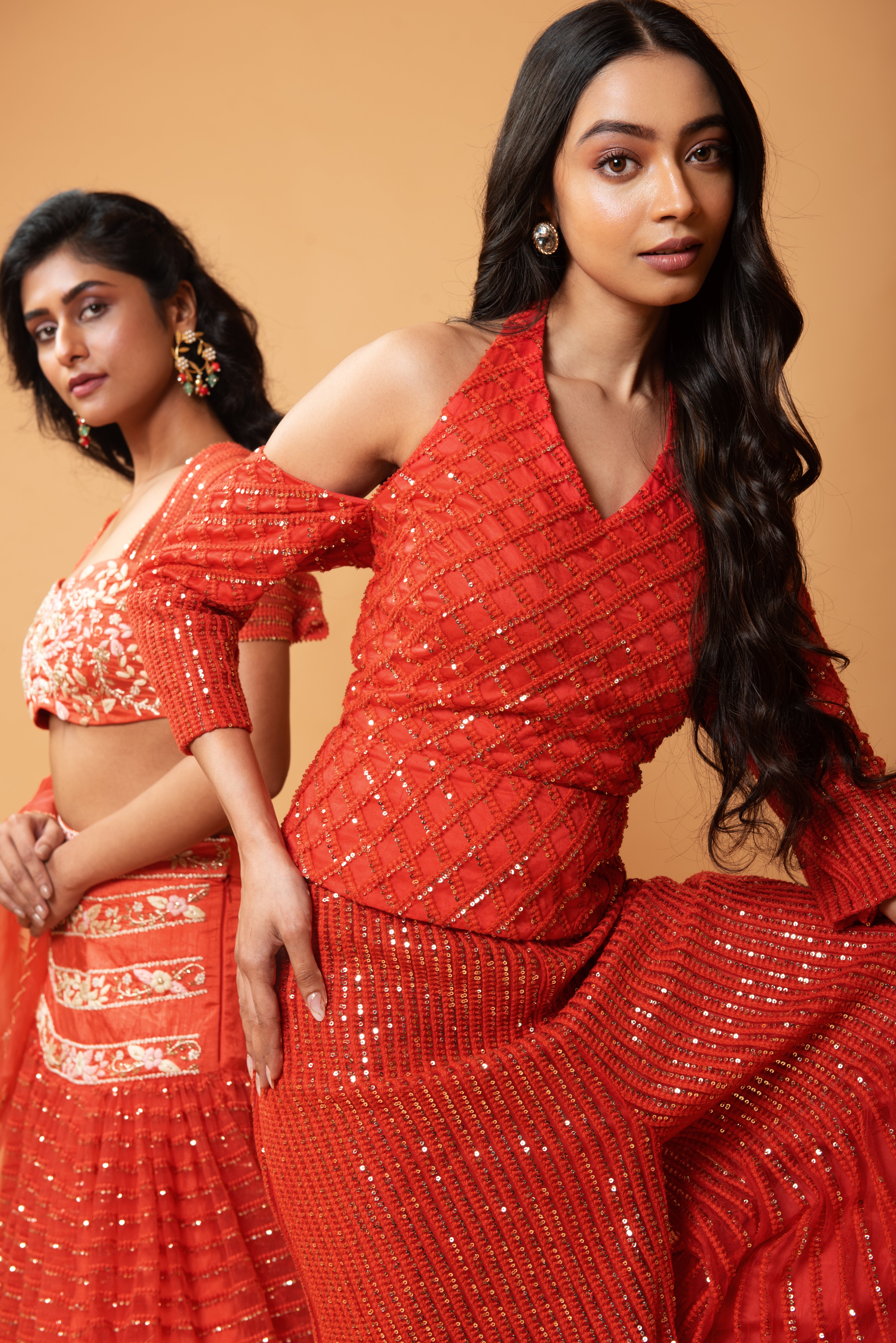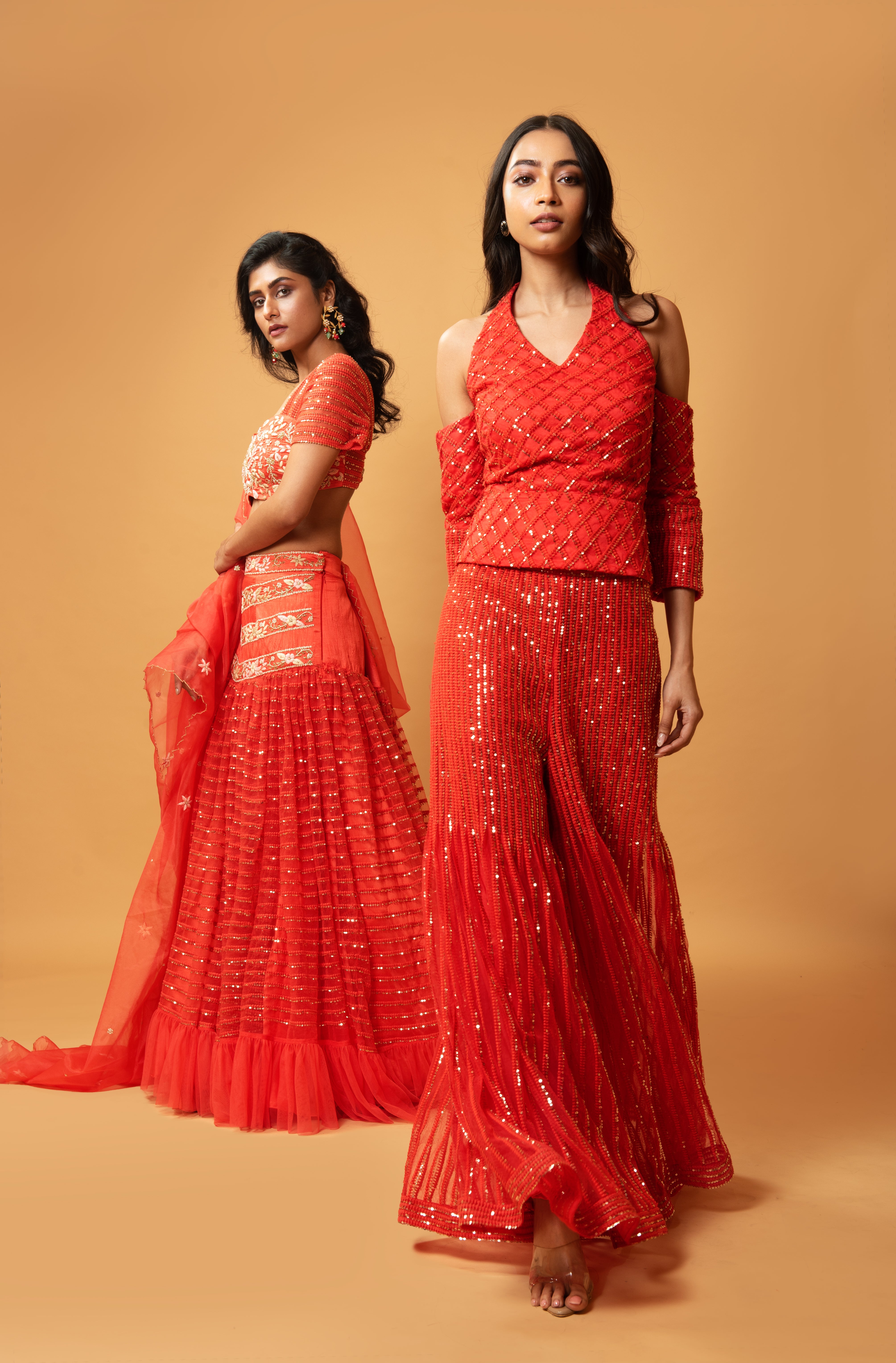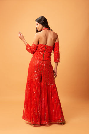 Red Sequined Sharara Set Made With Tulle Net Fabric. The Top Is Haulterneck With Offshoulder Style With Back Zip. The Fabric Is Machine Embroidered.