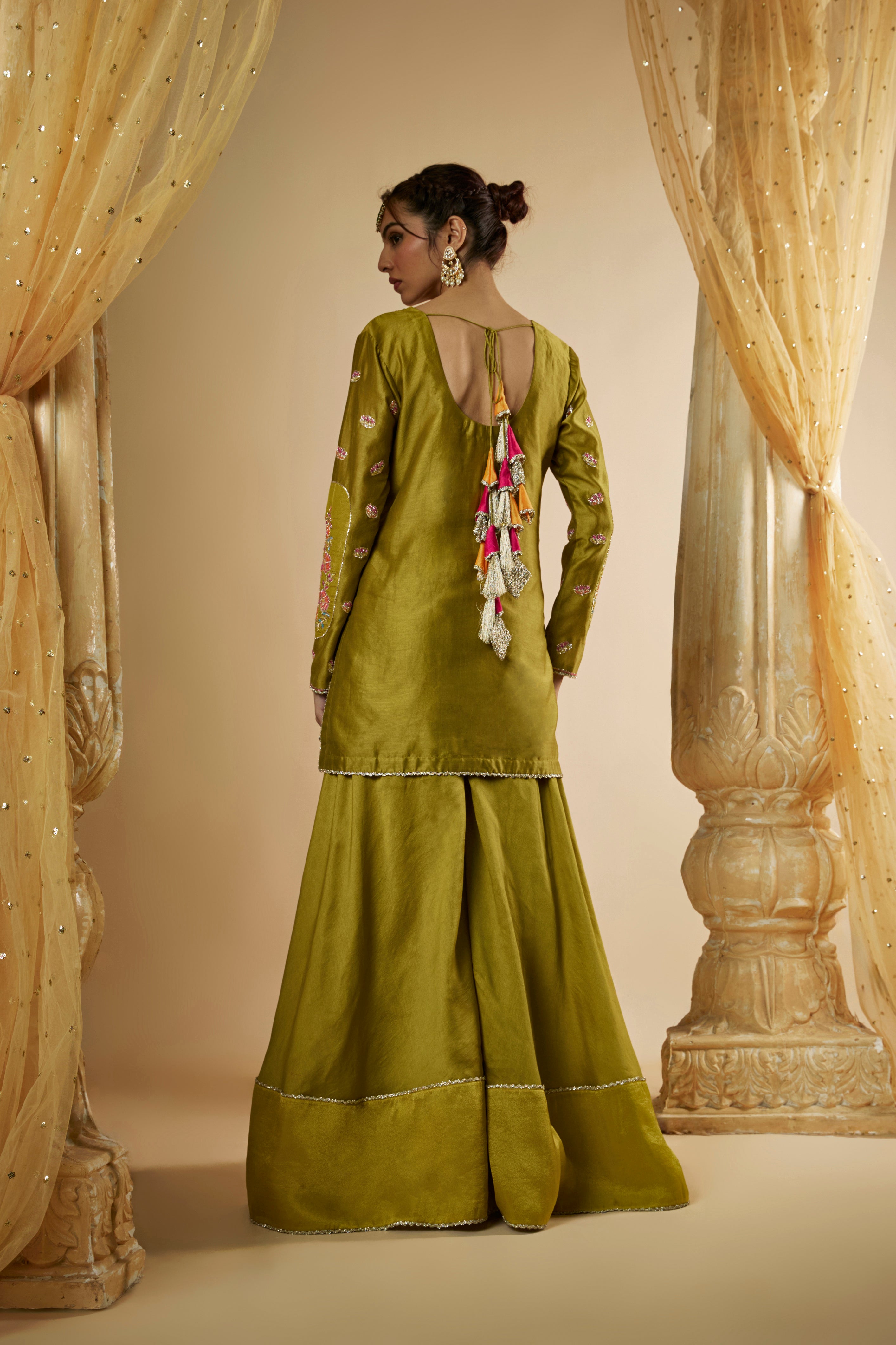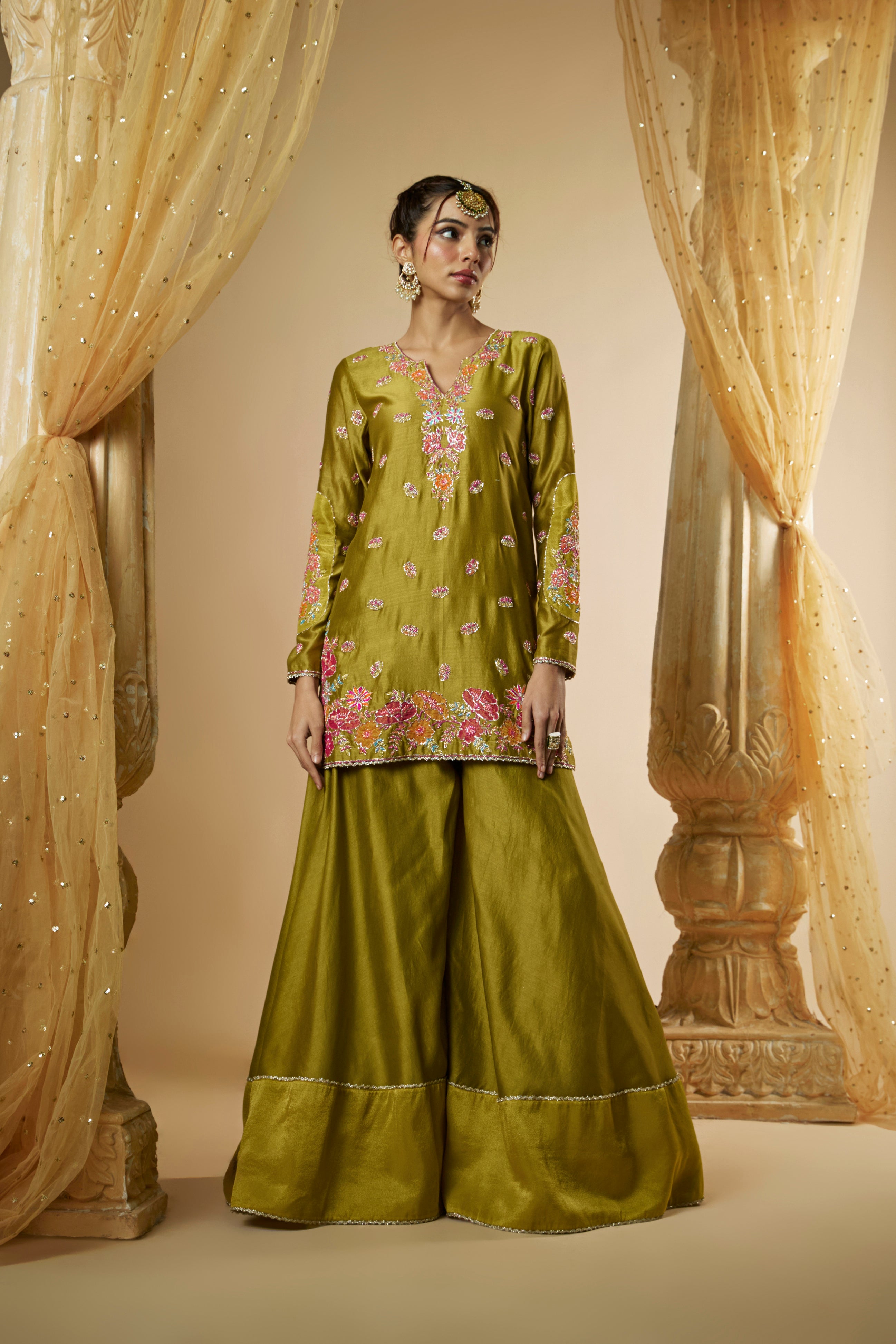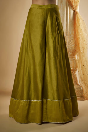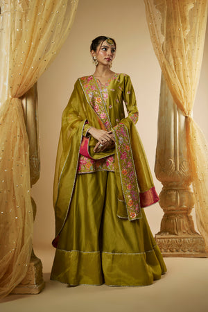 Featuring Our Olive Green Chanderi Silk Sharara Set. The kurta and sleeves are intricately hand embroidered with pitta work further enhanced with multicolored applique work, glassbeads and reshams. It is paired with matching flaired sharara and hand embroidered organza dupatta.