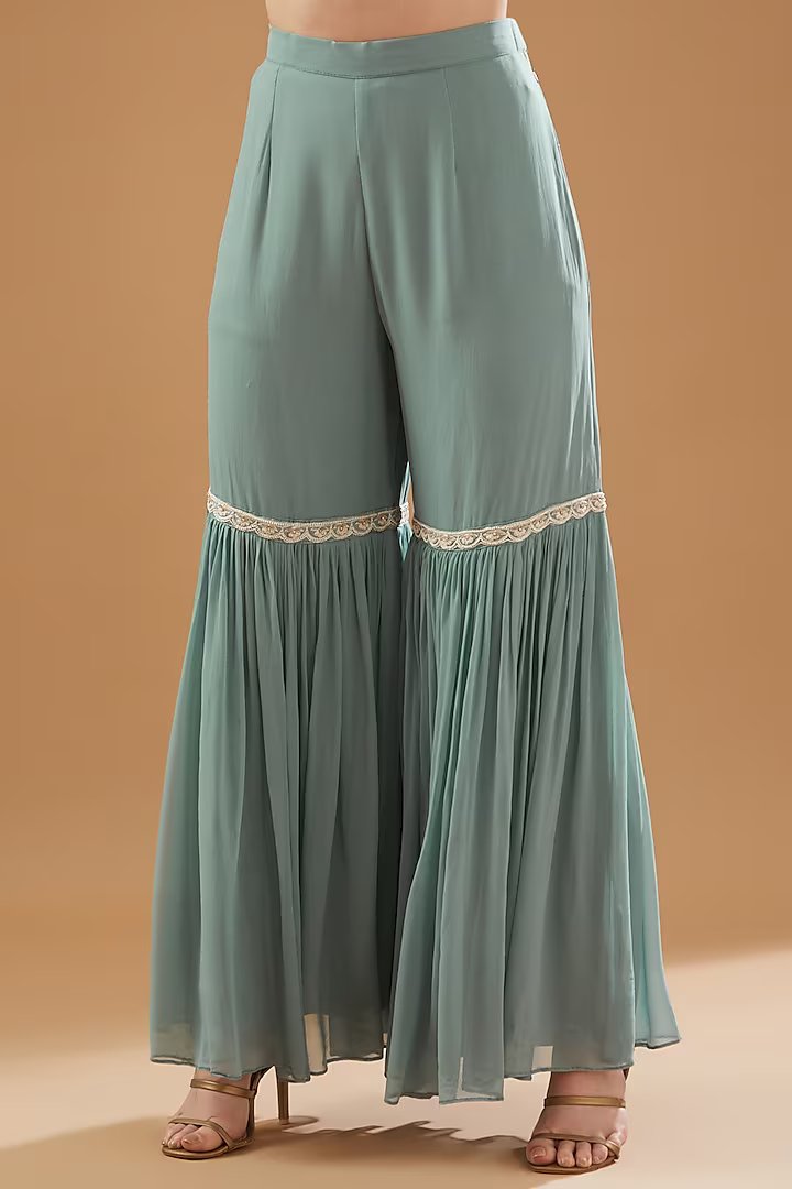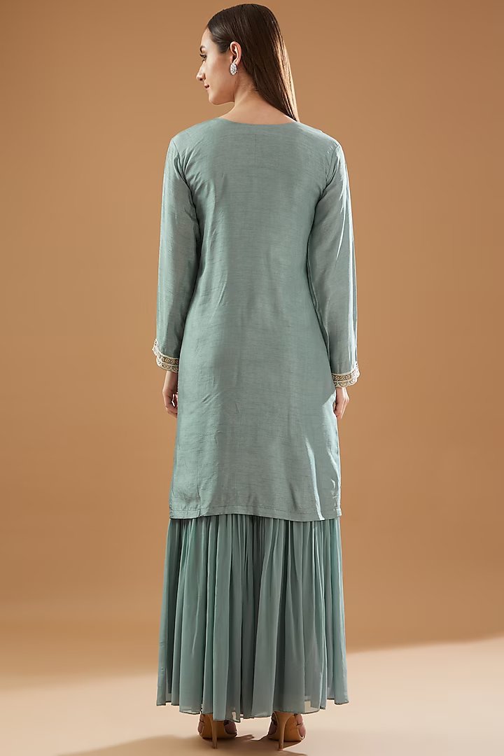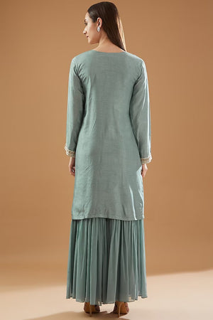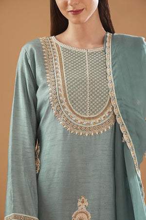 Sky Blue sharara set with Antique Zardosi,Pearls,Resham Embroidered on Shirt paired with Sharara and Dupatta.
