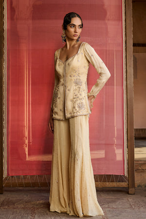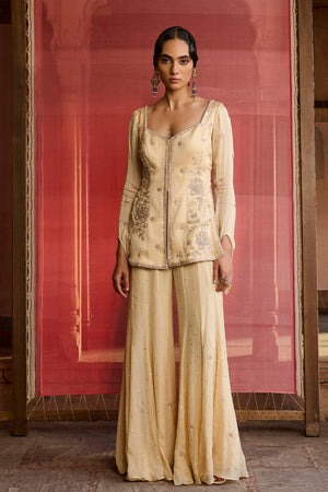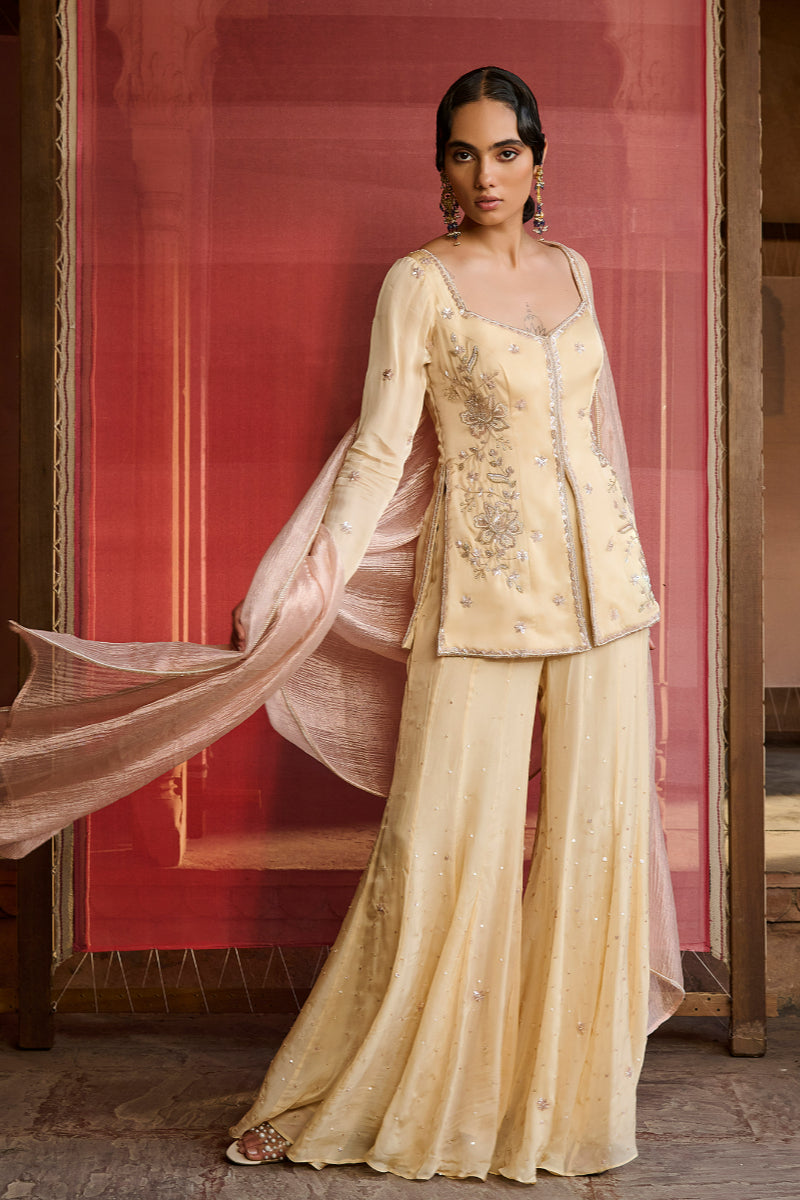 Featuring a beautiful butter yellow kurta with heavy placement hand embroidery on the front and small motifs on the jacket in satin organza. It is paired with flat chiffon sharara pants with small hand embroidered motifs spread all around. The dupatta comes in powder pink color in crushed tissue fabric with a border detailing and dainty motifs all over .