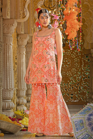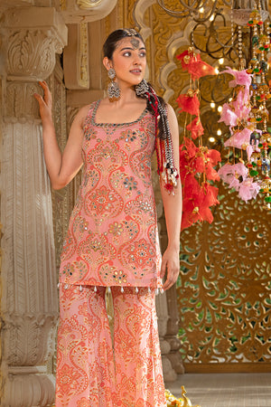From the bold and unapologetically vibrant RAANGBAAZ bridal collection by Sajeda Lehry, this sleeveless short kurta in a striking rose hue is a celebration in every stitch. Crafted from airy crepe, it features all-over mirror hand embroidery that catches the light — and every eye in the room. Delicate pearl tassels dance along the bottom hemline, adding a whimsical finish to your every move. Paired with coordinated printed georgette sharara pants that flow effortlessly with flair, this ensemble is designed for the bride who doesn’t stand still — the one who twirls through her rituals and chooses color over convention, joy over restraint. This is RAANGBAAZ — for the women who don’t just attend their wedding, they take the stage.