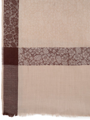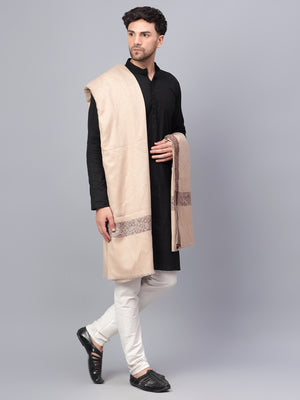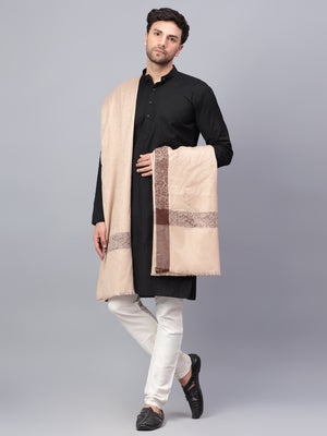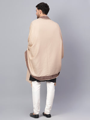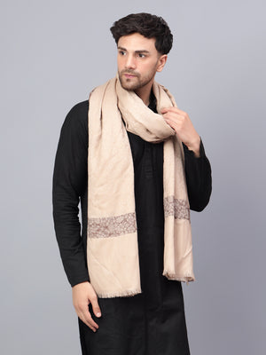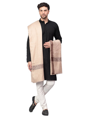 Mens Self Textured Contrast Woven Border Fine Wool Beige Shawl / Lohi