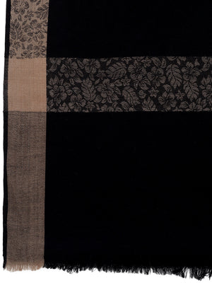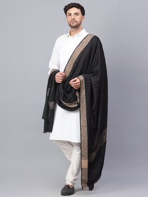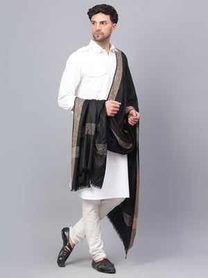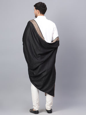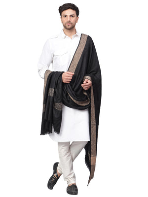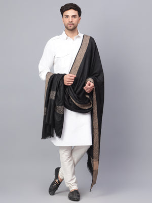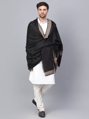 Mens Self Textured Contrast Woven Border Fine Wool Black Shawl / Lohi
