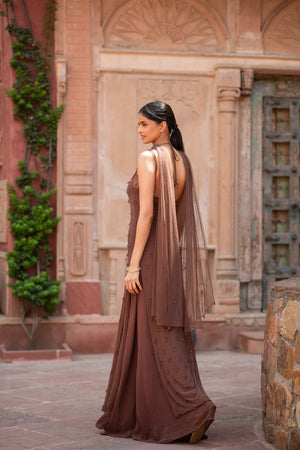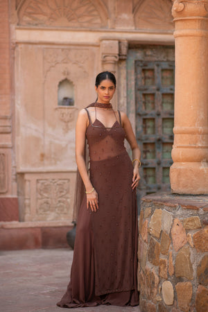 Sheer Bead Hanging Kurti Over A Bralette Blouse With A Sharara Paired With A Choker Dupatta.