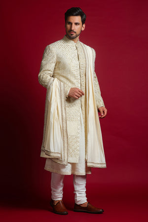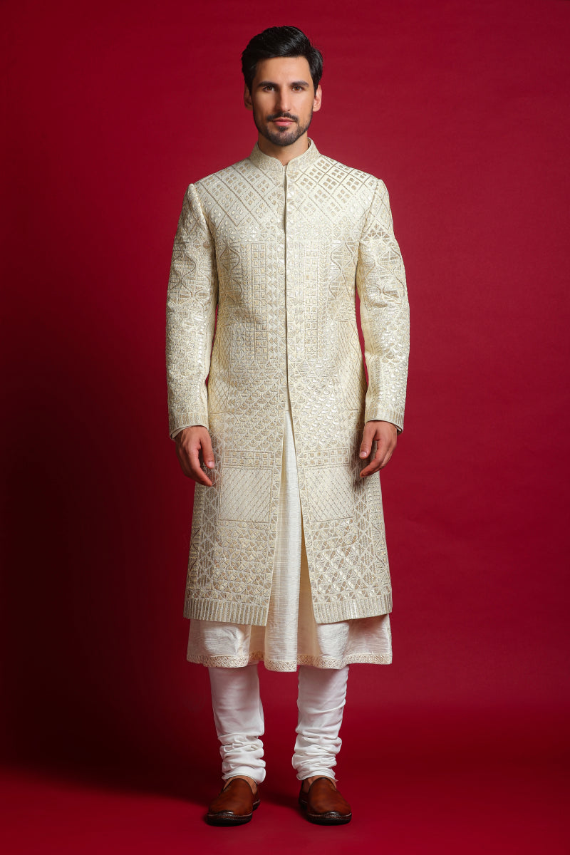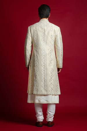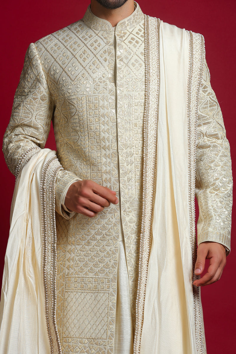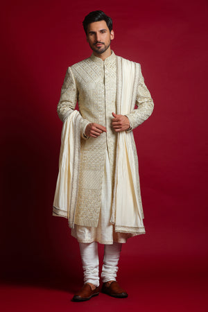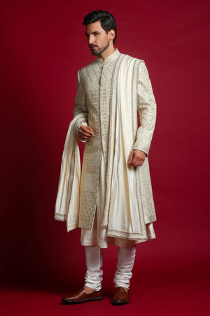 Ivory Luxe Sherwani Set, crafted from luxurious tissue silk, this sherwani is adorned with intricate gota embroidery, exuding timeless elegance. The ensemble includes an ivory kurta and churidar paired with a beautifully embroidered stole featuring a detailed thread and beaded border, adding a touch of refined craftsmanship to complete the look.