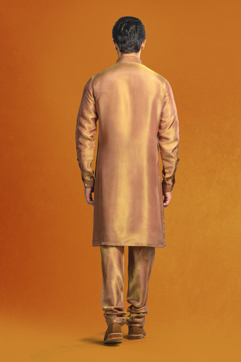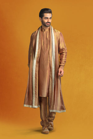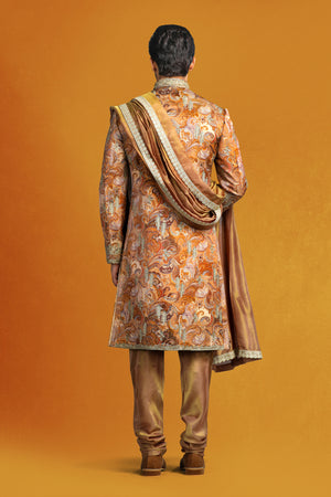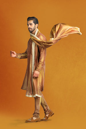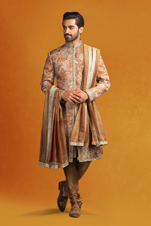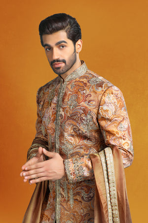 Copper Paisley Printed Sherwani Set showcases stunning abstract floral motifs and exquisite aari and zardozi embroidery that elevates its elegance. The refined beige hue is complemented by intricate sequins, adding a regal charm to the ensemble. Paired with a matching kurta, churidar, and a coordinating tissue silk stole, this four-piece set is perfect for grand celebrations and special occasions.
