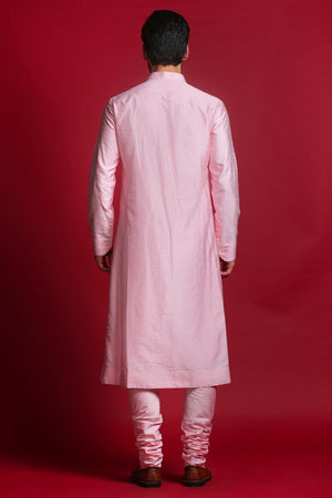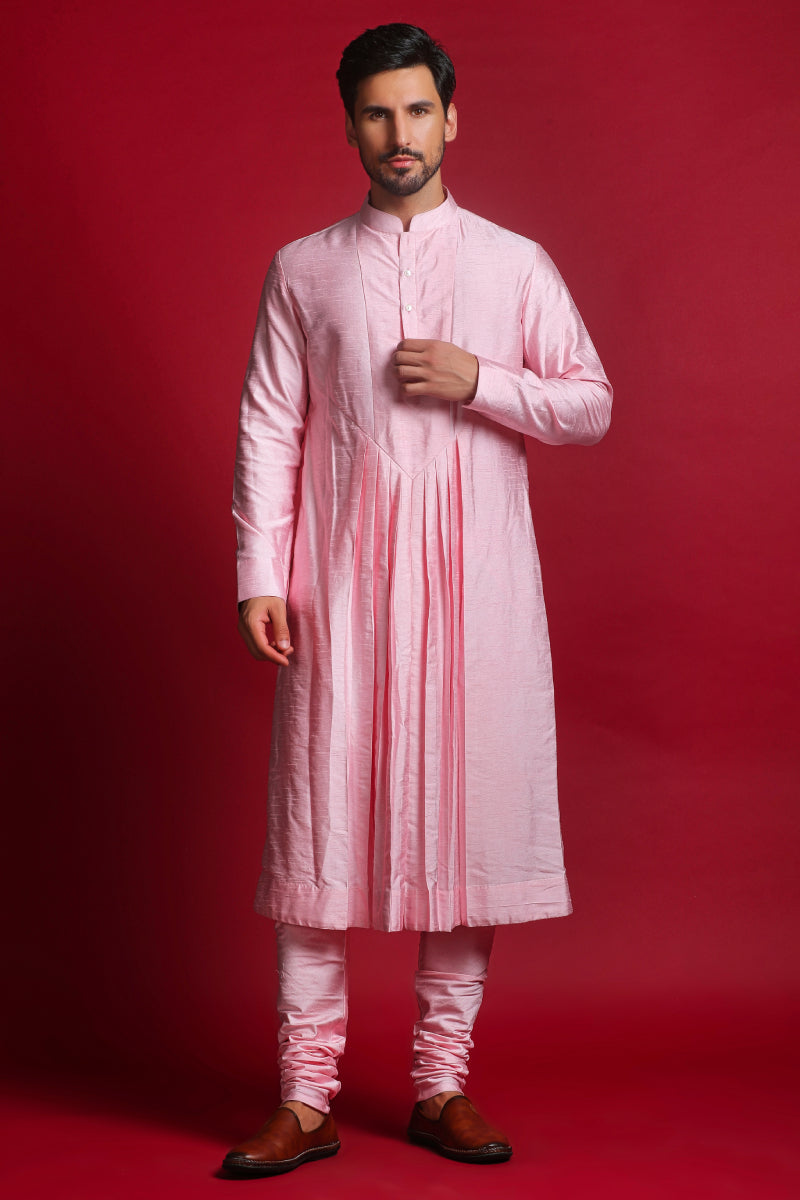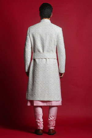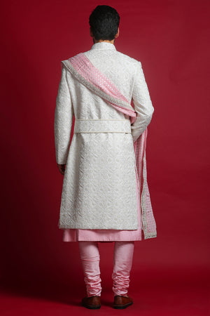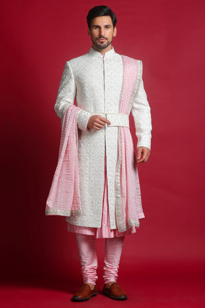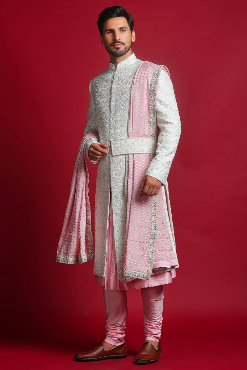 Royal Cream Embroidered Sherwani Set: This exquisite sherwani is adorned with self-thread embroidery, featuring intricate detailing of sequins and beads, giving it a truly royal touch. Paired with a contrasting pink kurta, churidar, and a matching pink stole, this ensemble perfectly blends elegance and sophistication, making it ideal for grand occasions.