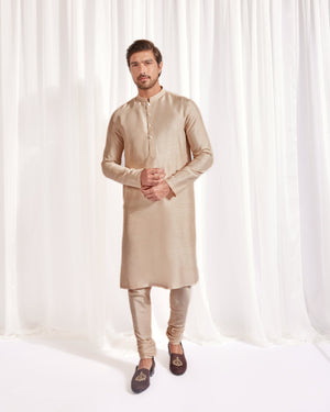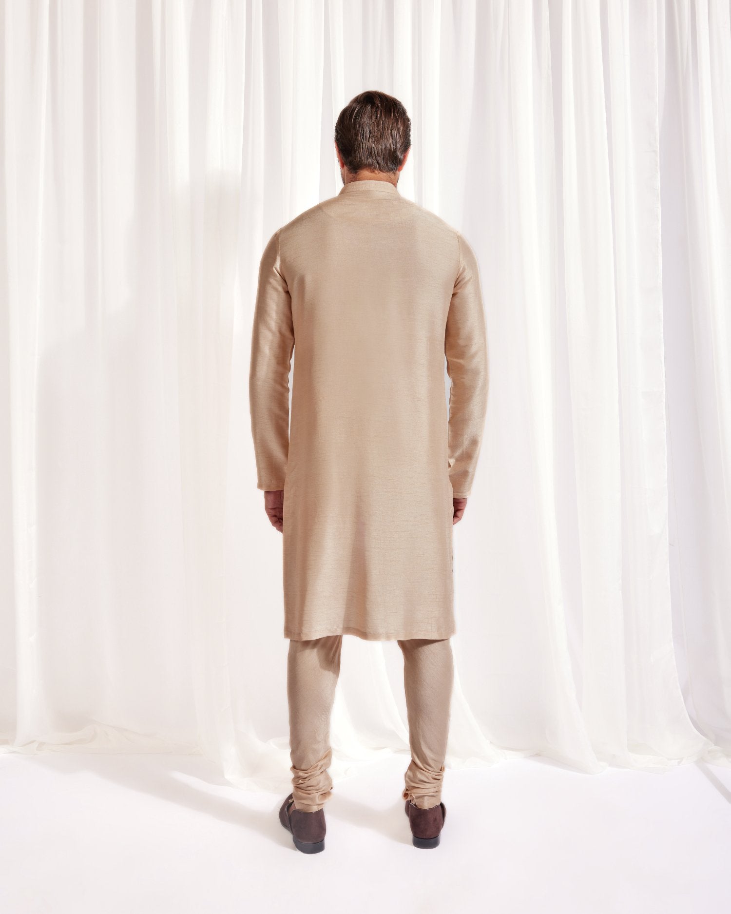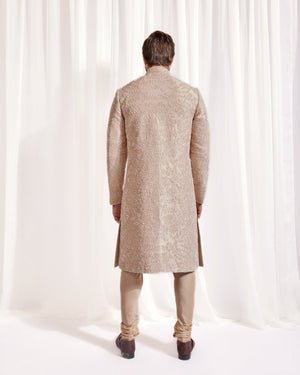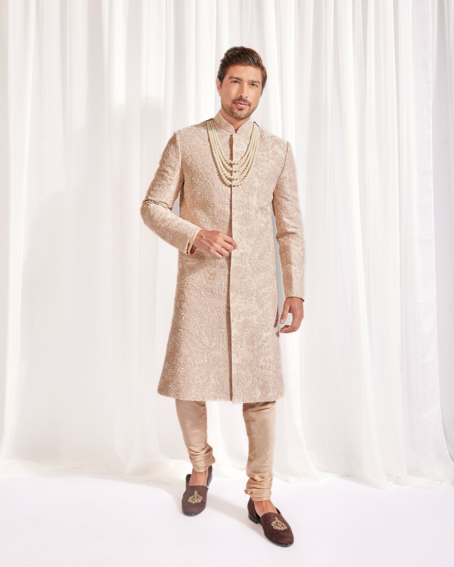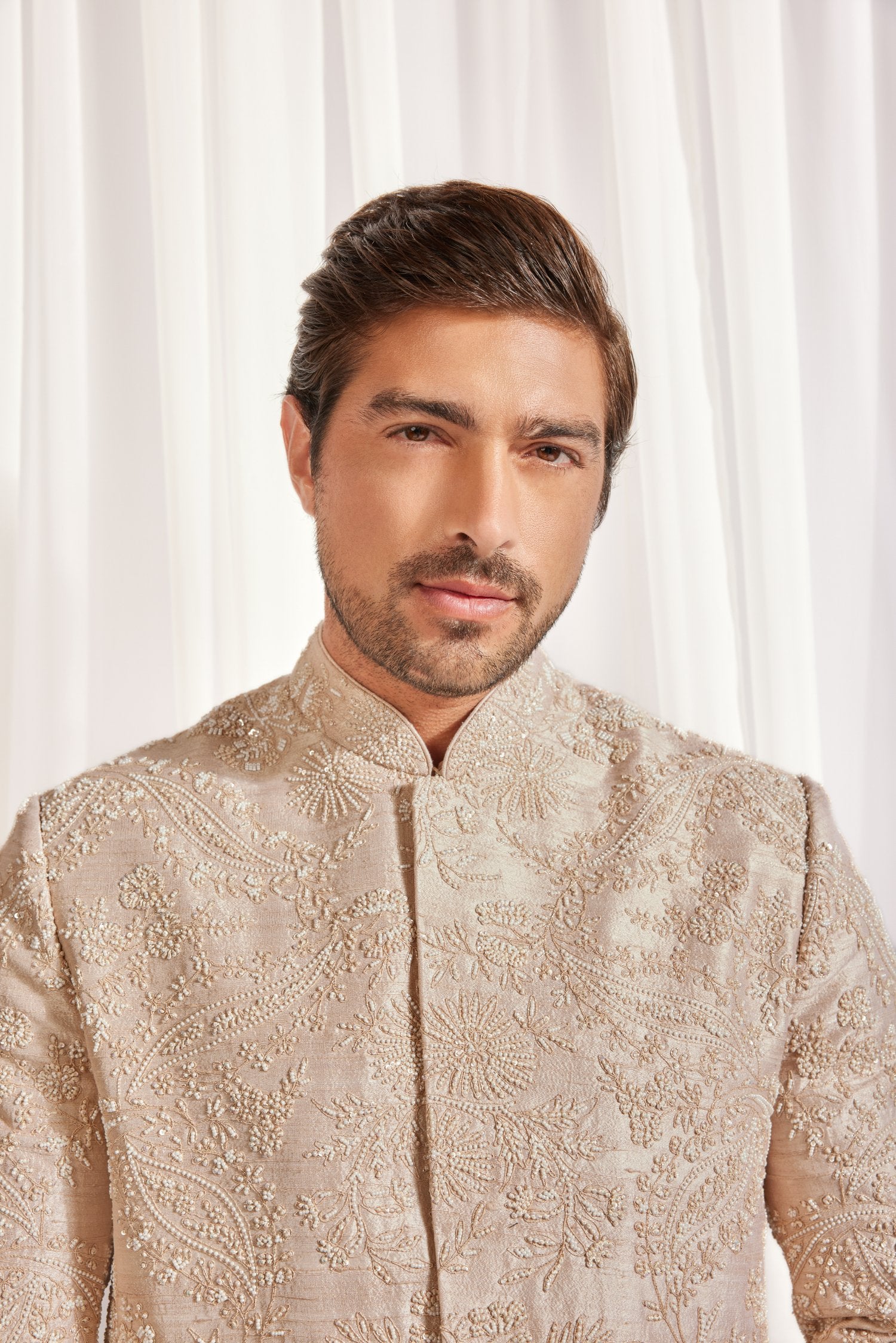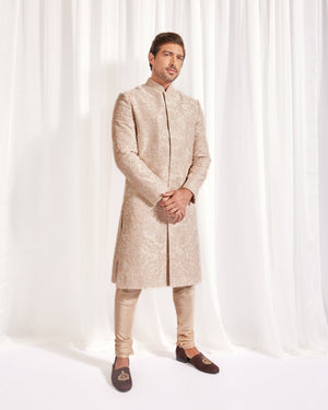 Champagne rawsilk classic sherwani with allover dori,pearl,katdana,sequins etc. hand embroidery teamed with swiss rawsilk tonal under kurta and swiss raw silk tonal churidar