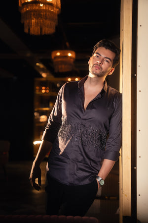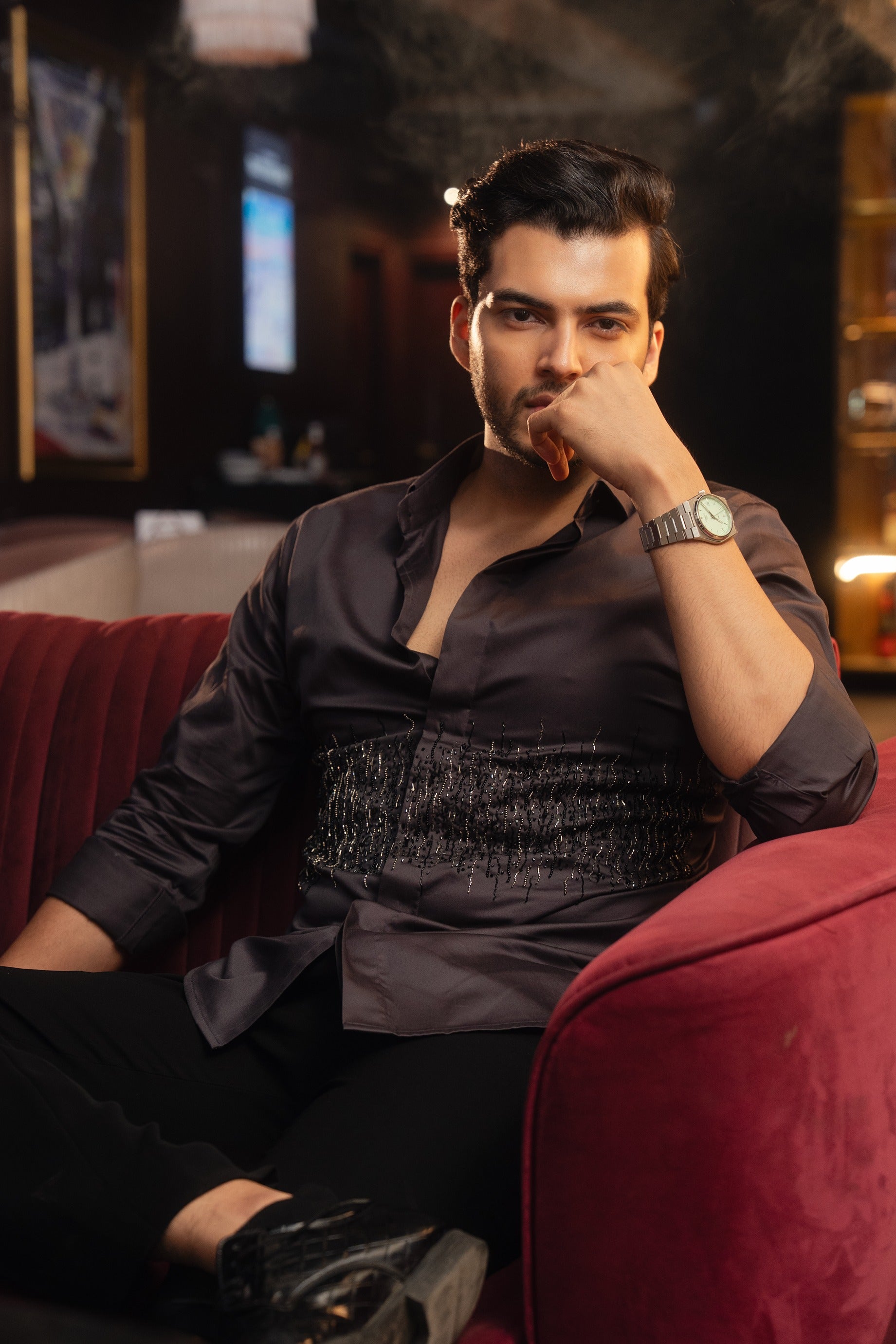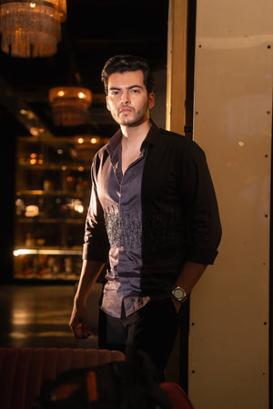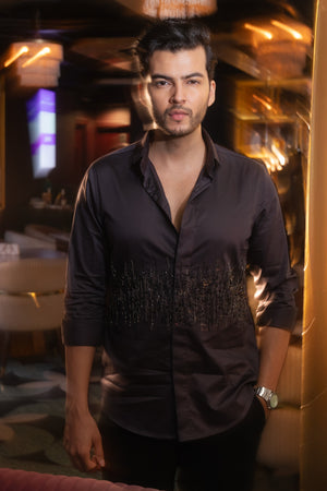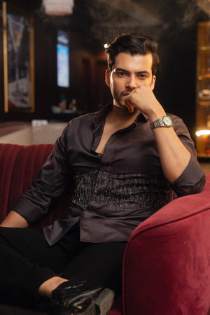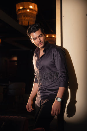 Crafted in a deep grey hue, this shirt is adorned with the finest beads and Swarovski crystals. The embroidery is thoughtfully placed to catch the light just right, adding refined brilliance to a classic silhouette.