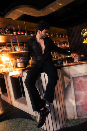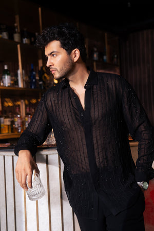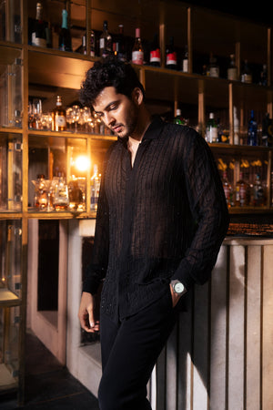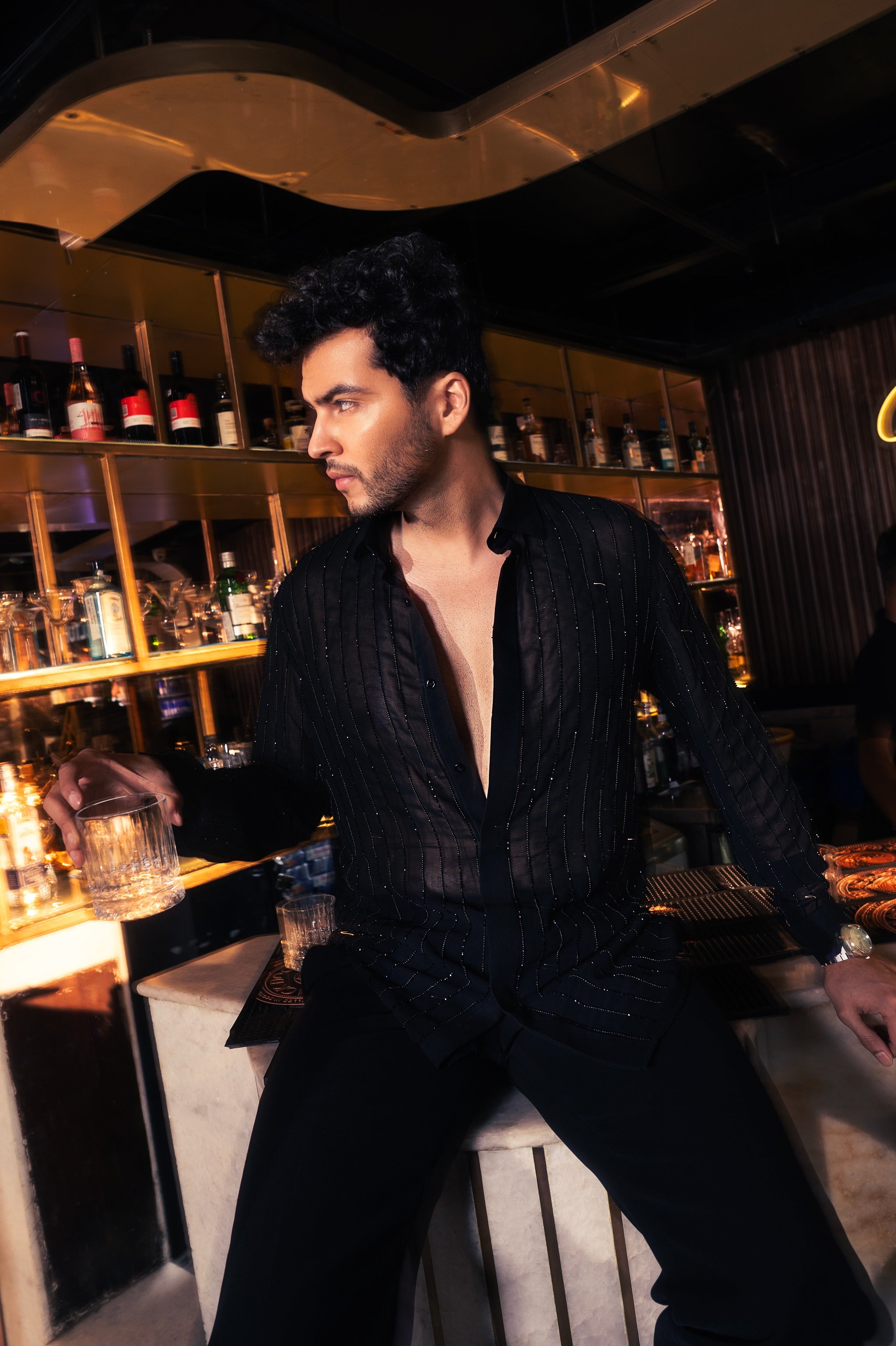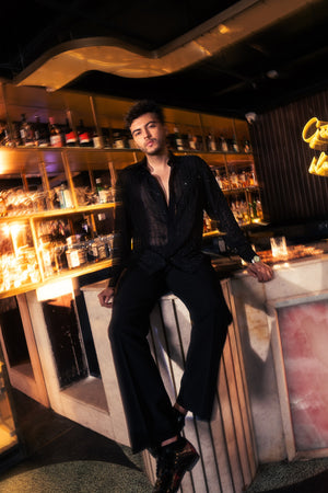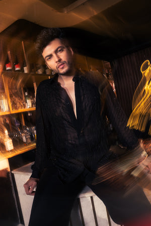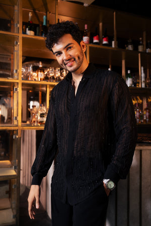 Exquisitely hand-embroidered in black-on-black, this shirt features intricate beadwork that highlights your curves with refined precision. A timeless blend of craftsmanship and subtle sensuality.