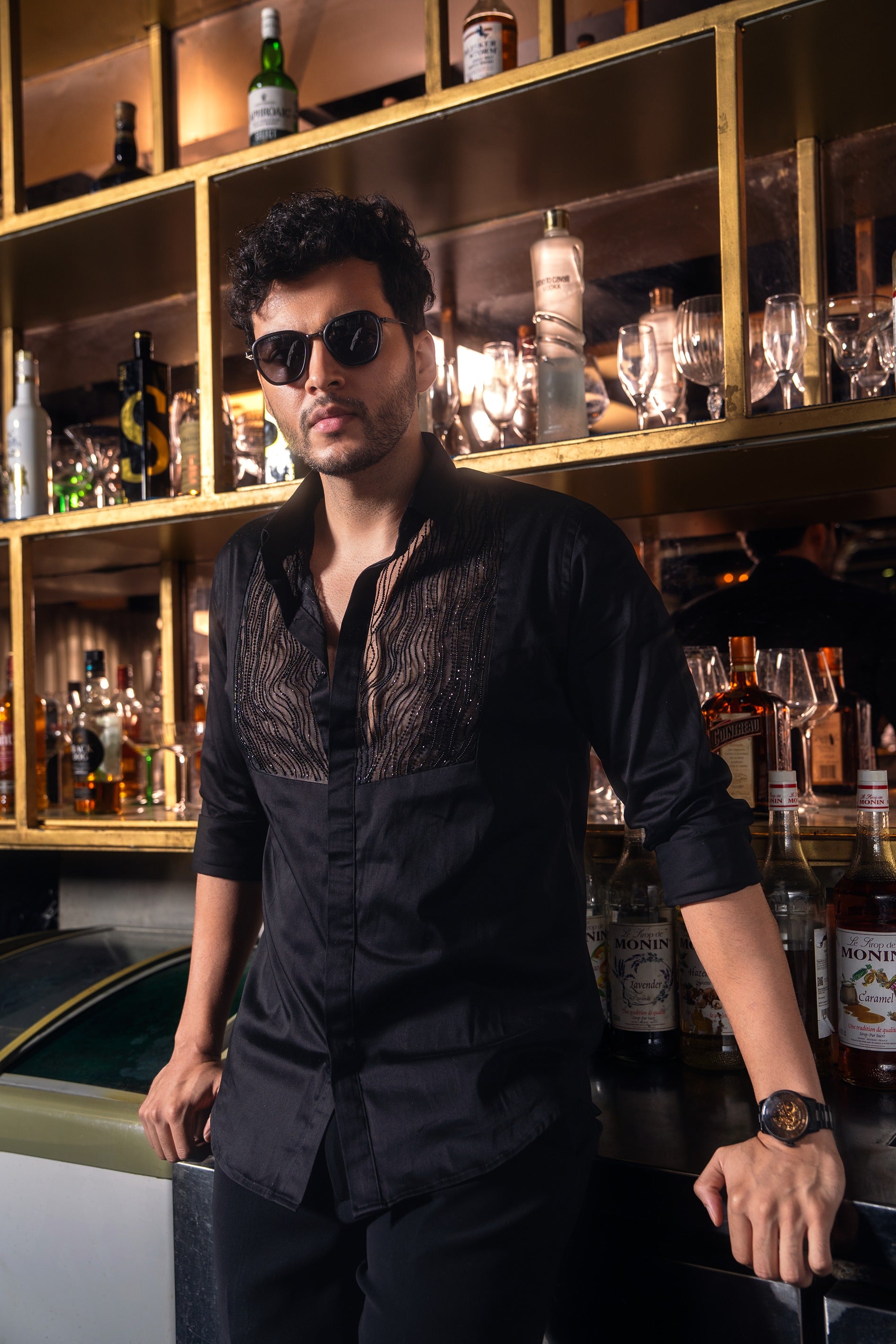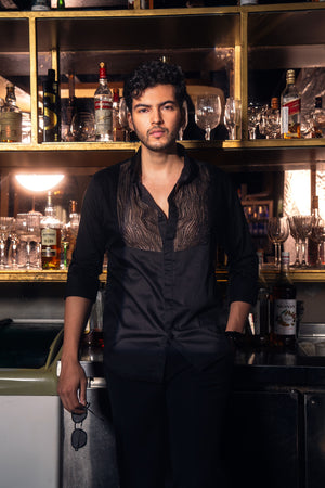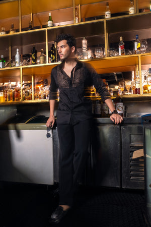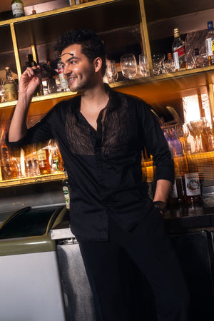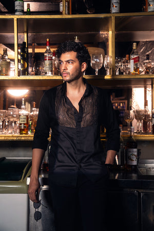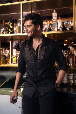 A black-on-black masterpiece, intricately hand-embroidered with the finest beads and crystals, delicately laid on sheer organza for a subtle play of texture and depth.