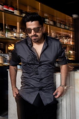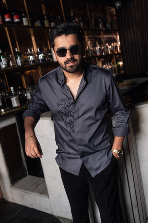 In a soft grey tone, this shirt features a striking hand-embroidered lion motif—crafted entirely by hand using fine beadwork. A bold symbol of strength, detailed with precision and artistry.
