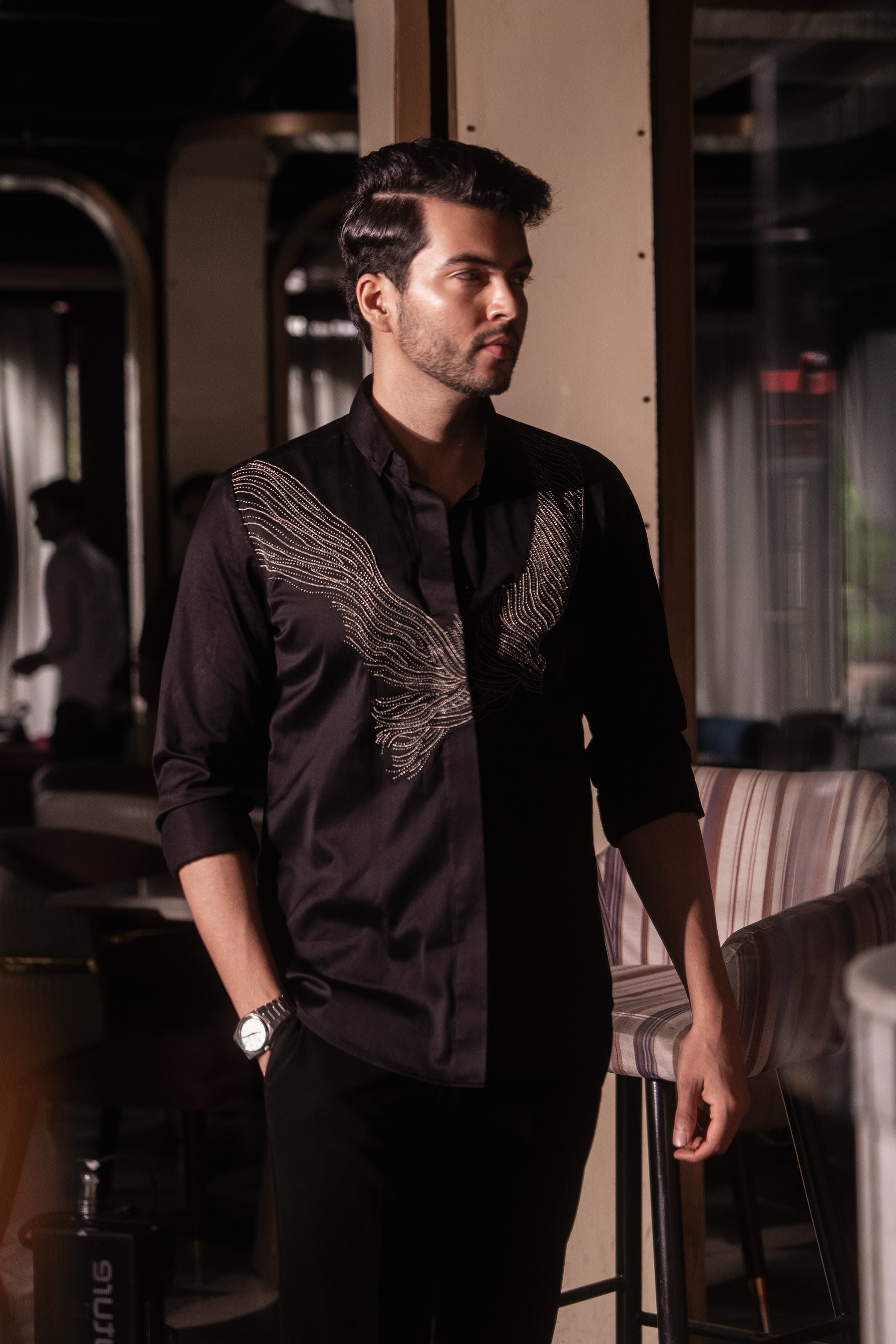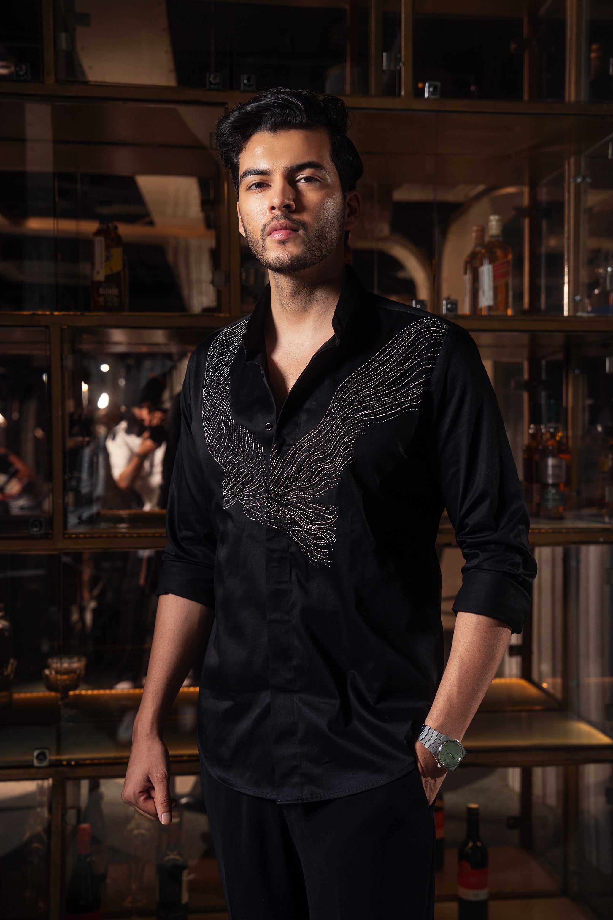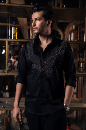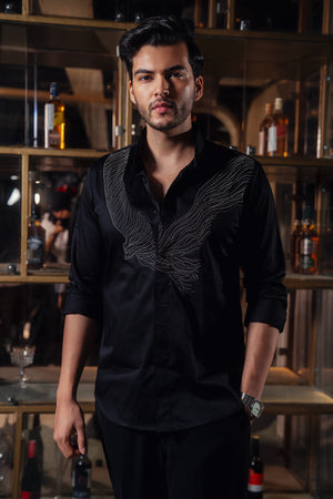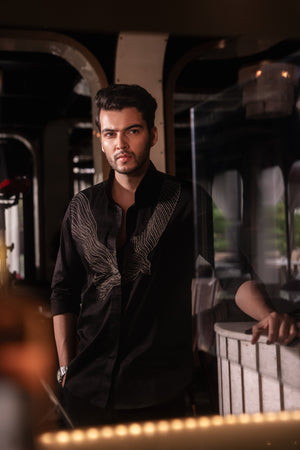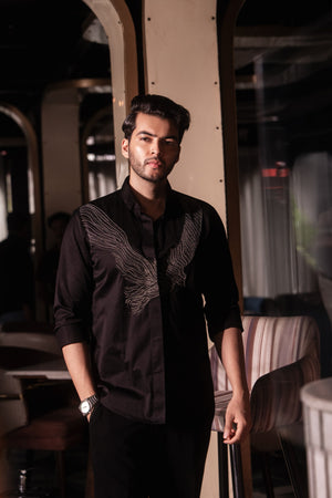 This black shirt features a carefully designed motif that drapes gracefully over the body. Hand-embroidered with antique beads, the detailing adds timeless elegance and subtle texture to the silhouette.