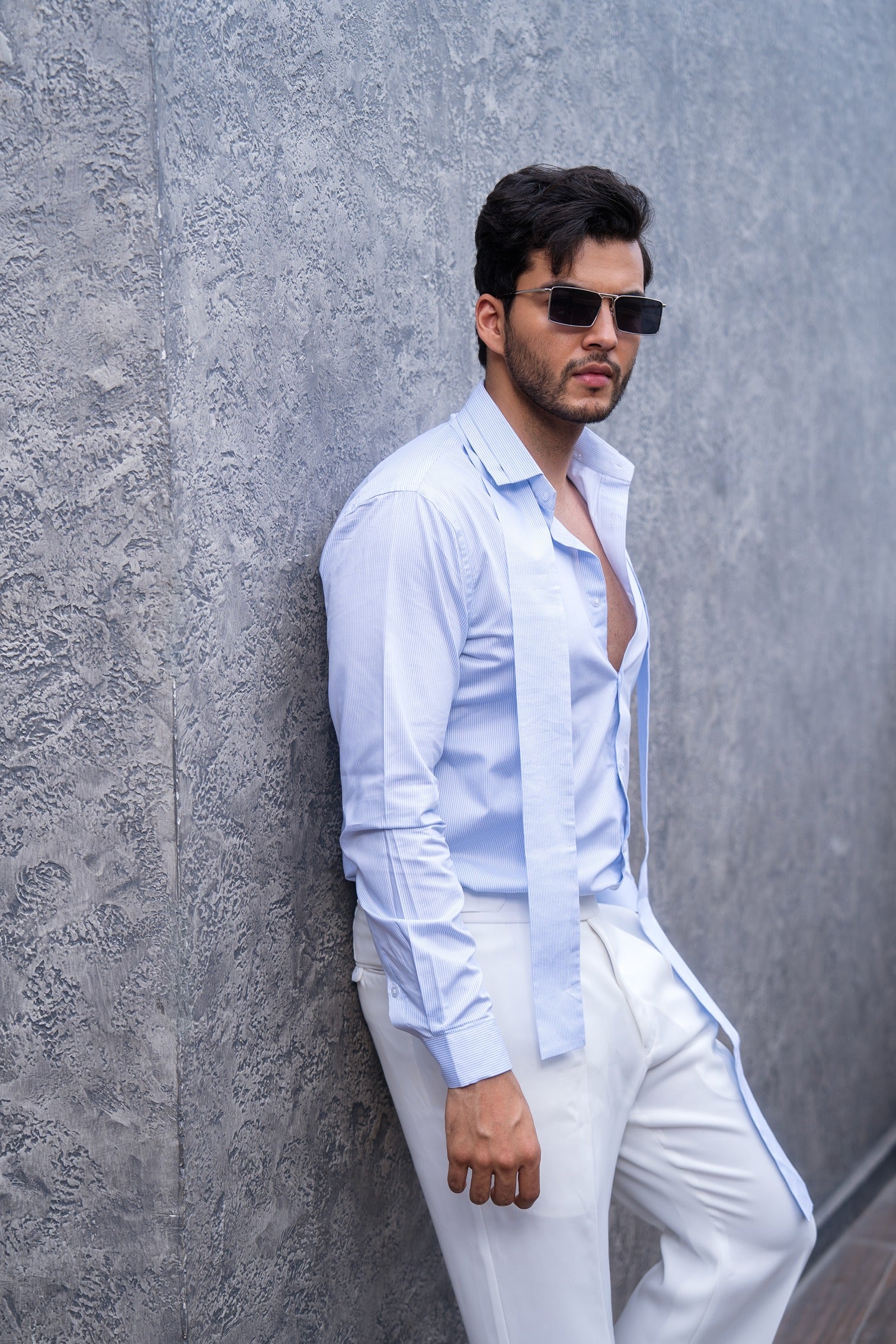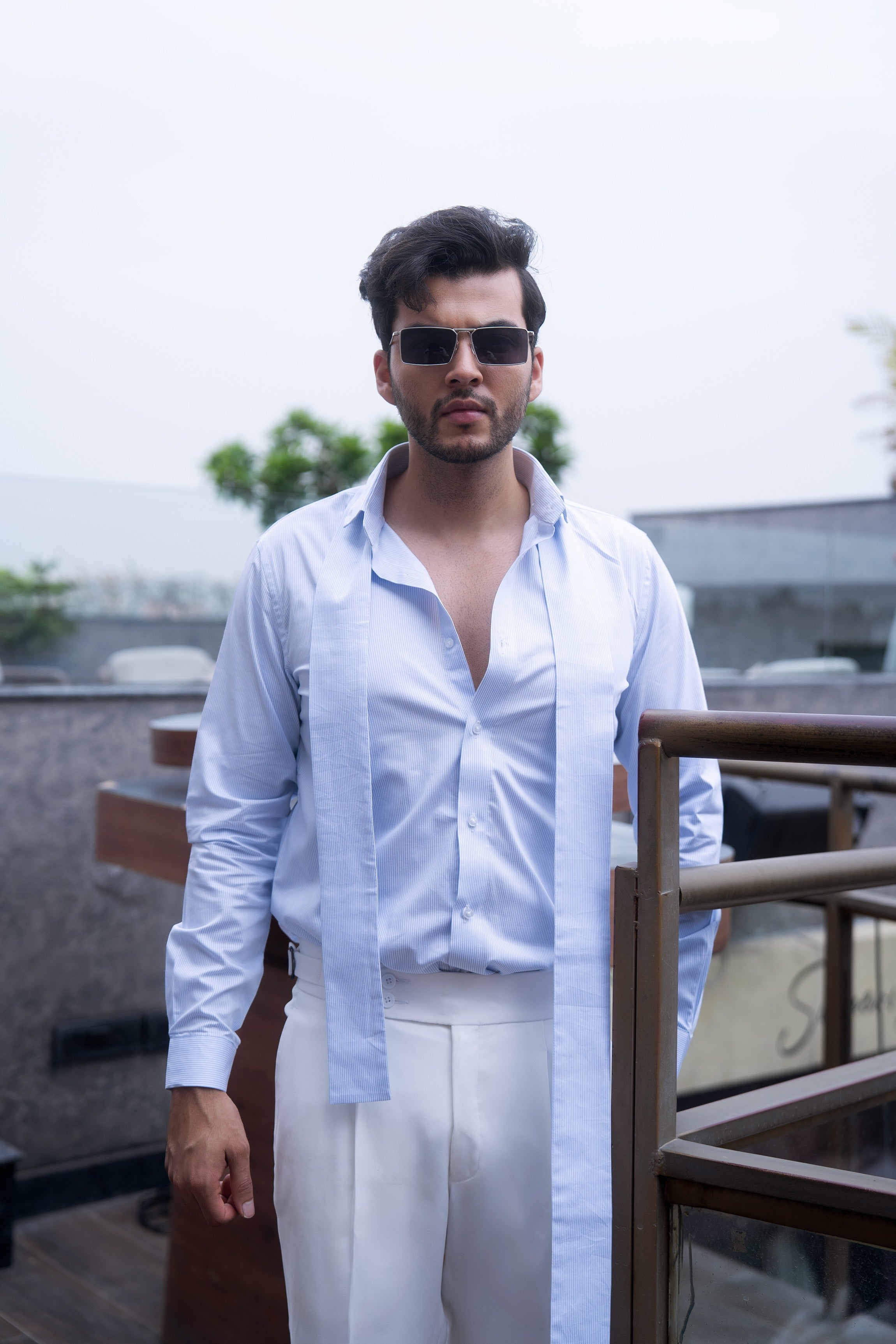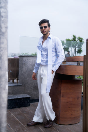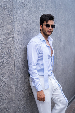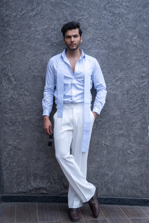 Featuring classic blue and white vertical stripes, this shirt is designed with a unique panel that gracefully drapes over the shoulders, adding an elegant twist to a timeless pattern.