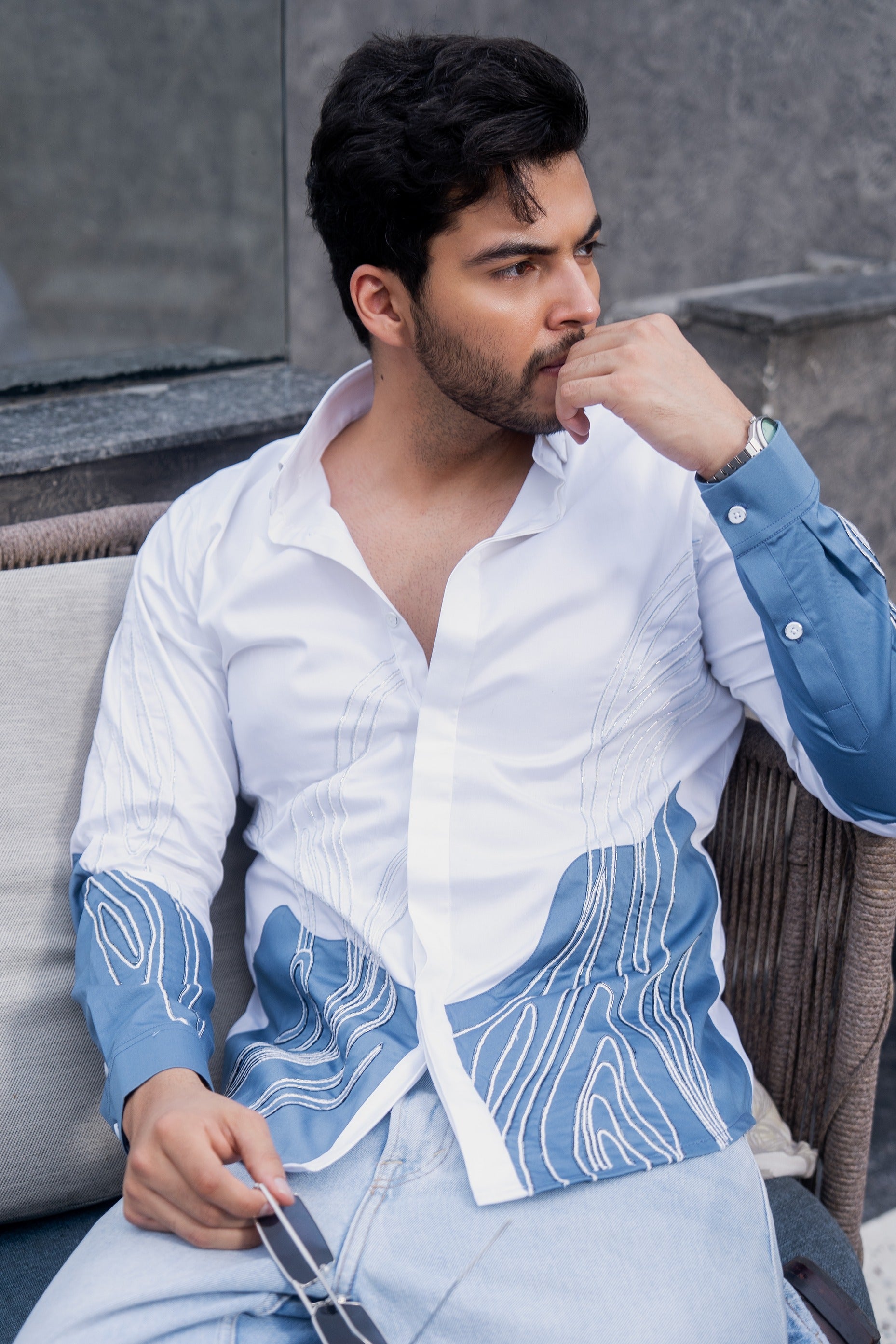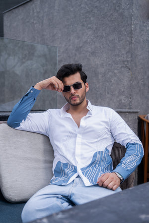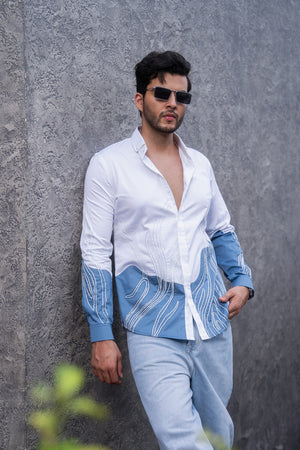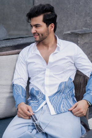 This dual-color shirt in blue and white is entirely hand-embroidered with exquisite 3D detailing, enhanced by fine crystals for a stunning blend of texture and shimmer.