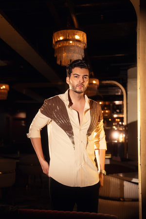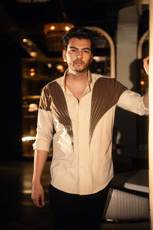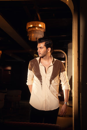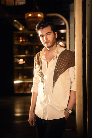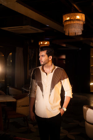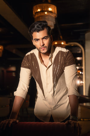 Featuring two rich shades of brown, this dual-color shirt is hand-embroidered with thoughtfully placed lines that create a sleek and sophisticated silhouette.