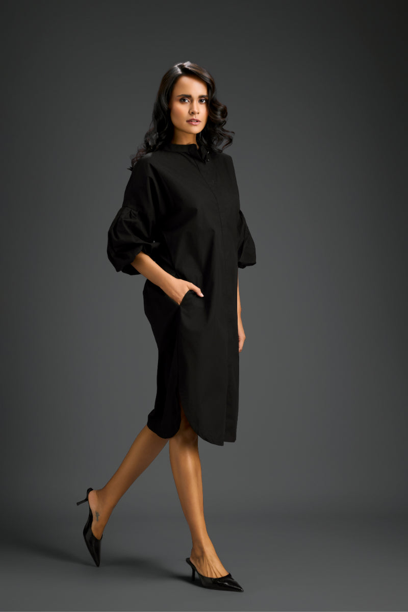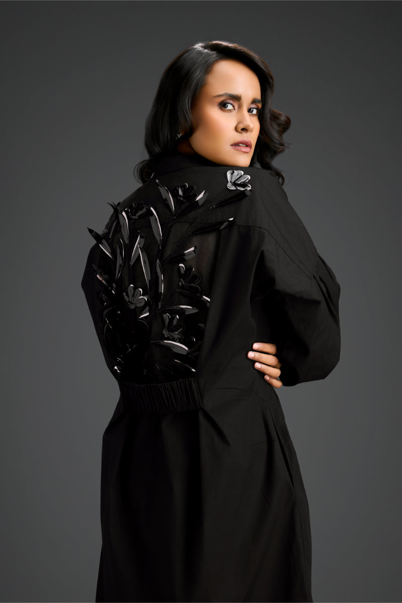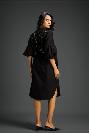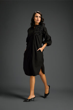 Black Shirt Dress With Puffed Sleeves, Sheer Back, 3D Florals & Glossy Leaf Embellishments