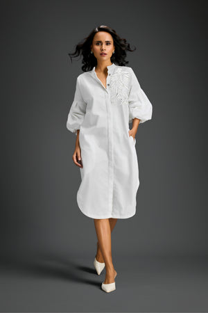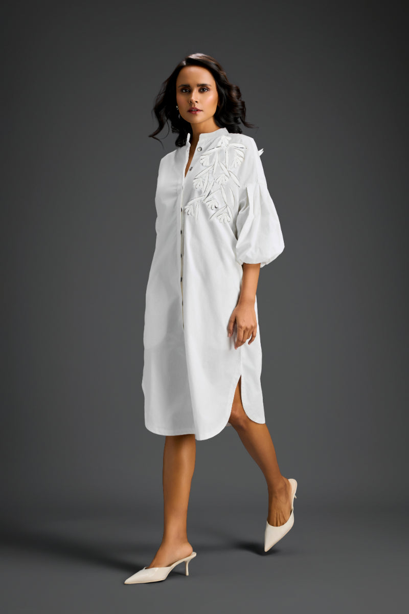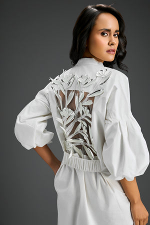 White Shirt Dress With Puffed Sleeves, Sheer Back, 3D Florals & Glossy Leaf Embellishments