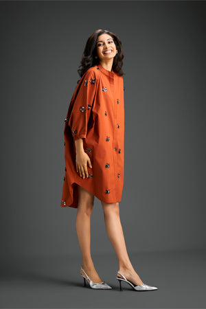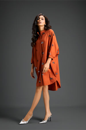 Rust Oversized Cotton Shirt Dress, Detailed With Hand-Embellished Butterfly Motifs And Soft Pleated Sleeves