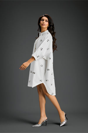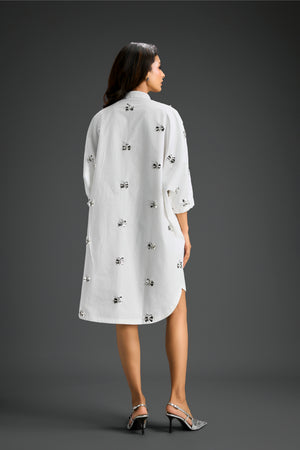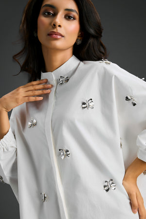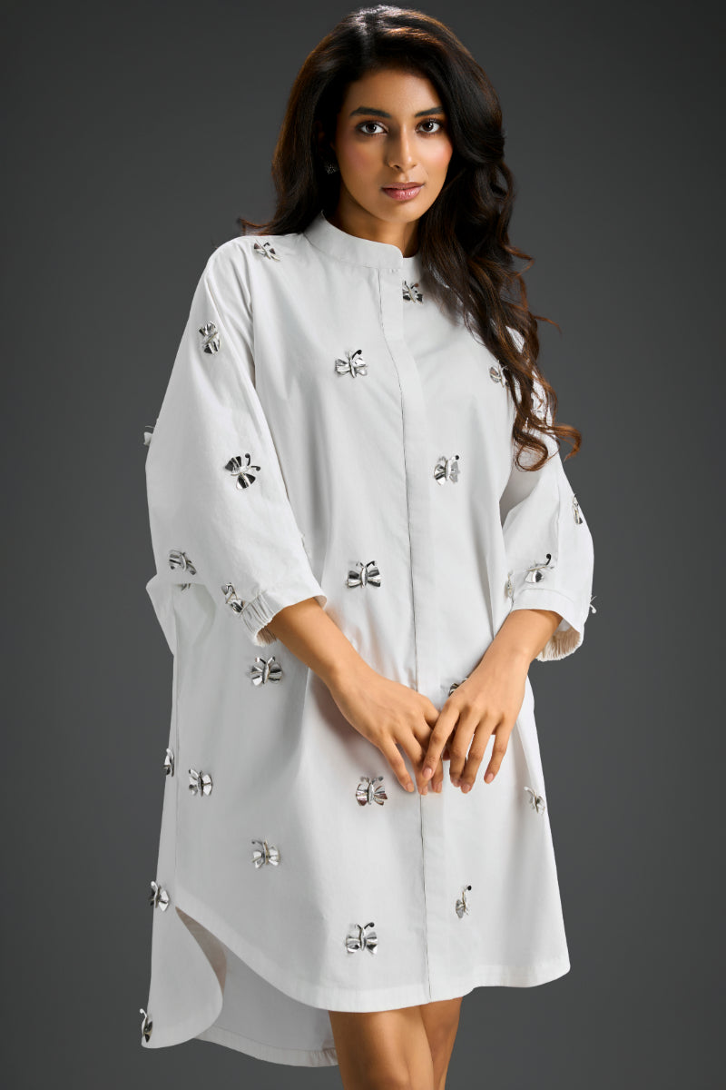 White Oversized Cotton Shirt Dress, Detailed With Hand-Embellished Butterfly Motifs And Soft Pleated Sleeves