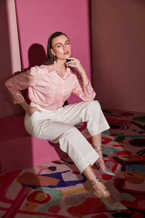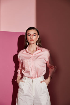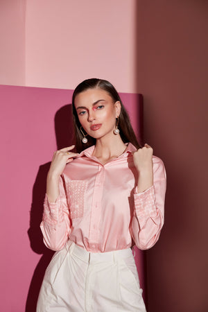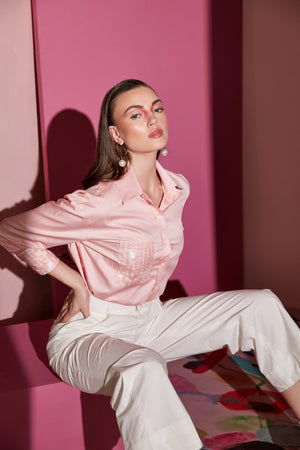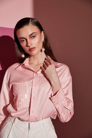 Featuring a peaches pink shirt with sequins one side pocket embroidery