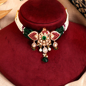 The intricate peacock motif adds a touch of regal charm, while the semi-precious pearls soften the look with timeless sophistication. Complete with matching earrings, this Jadau Mossanite choker set pairs beautifully with lehengas, sarees, and designer ethnic outfits.