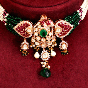 Make a statement with this designer Jadau choker set, featuring a stunning peacock-inspired design embellished with sparkling Mossanite stones and delicate semi-precious pearls. Crafted with precision, this choker combines heritage artistry with modern elegance, making it perfect for weddings, festive celebrations, and special occasions.