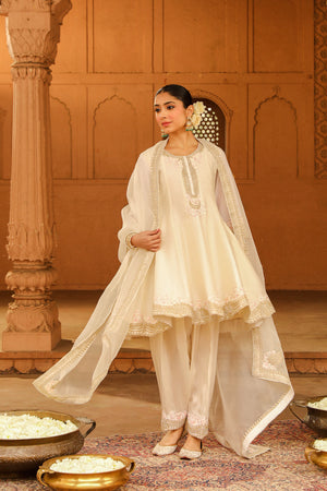 The short kalidaar Faria ensemble is made in pure silk chanderi fabric teamed up with a dogri salwar and a silk organza dupatta. The outfit is having a zero neck with placket and three-quarter sleeves. The outfit is adorned with Kashmiri tilla and parsi gara embroidery highlighted with basra moti. The outfit is finished with scallop detailing.