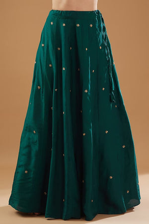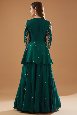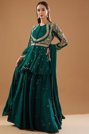 Rama Green Short Anarkali with Heavily Embroidered Yoke and Sleeves Paired with Skirt and Embellished Dupatta.