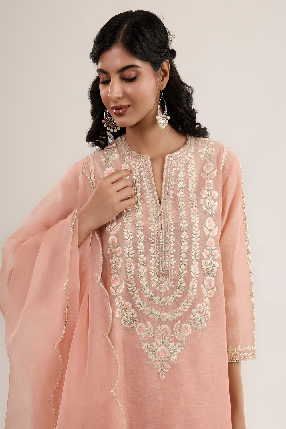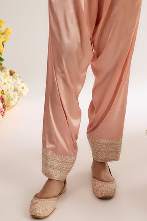 This beautiful Short Choga ARWA is made from Chanderi fabric, it is teamed with Satin salwar and sheer embroidered oragnza dupatta. This outfit features a classic neck design and has three quater sleeves