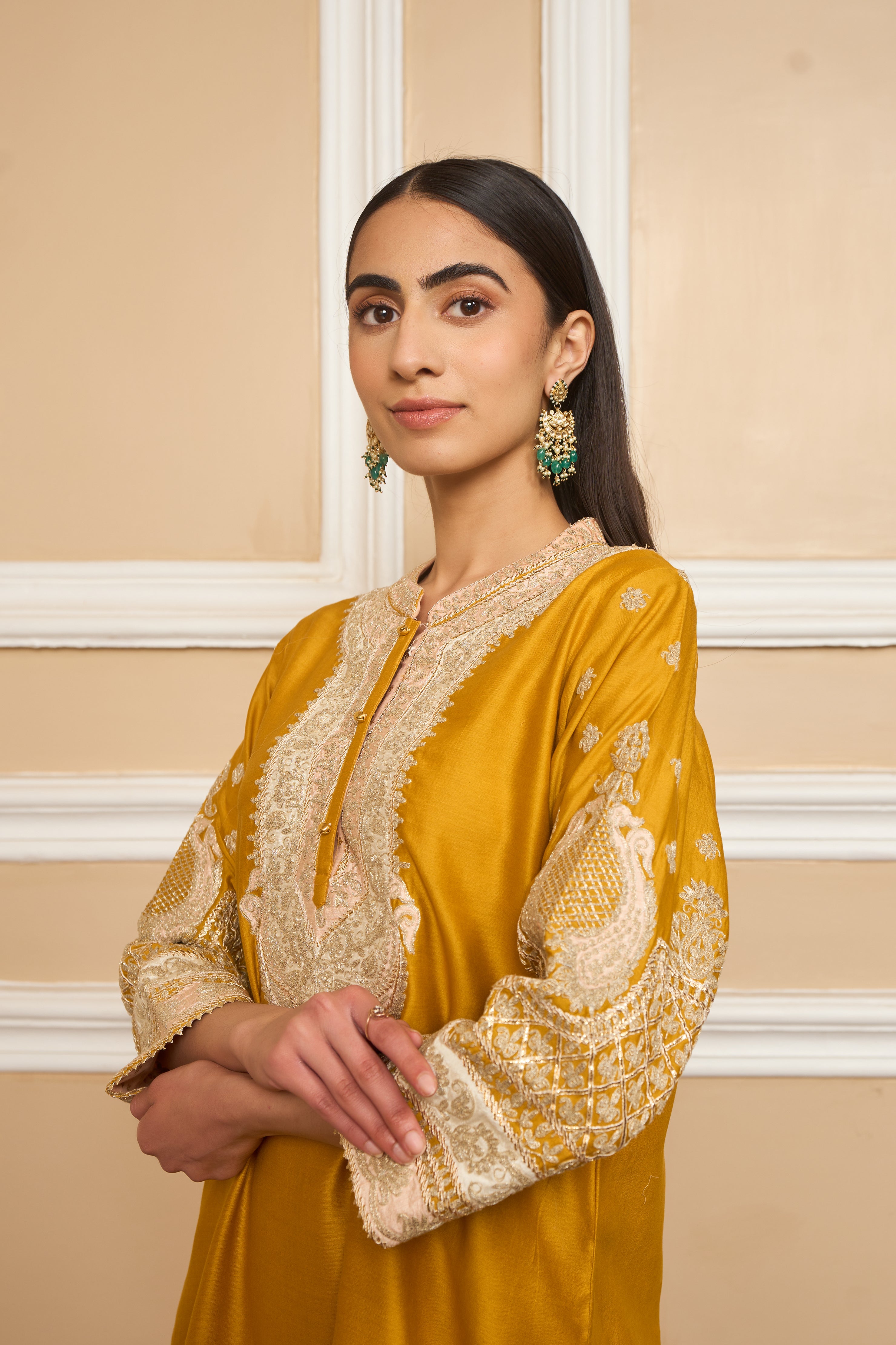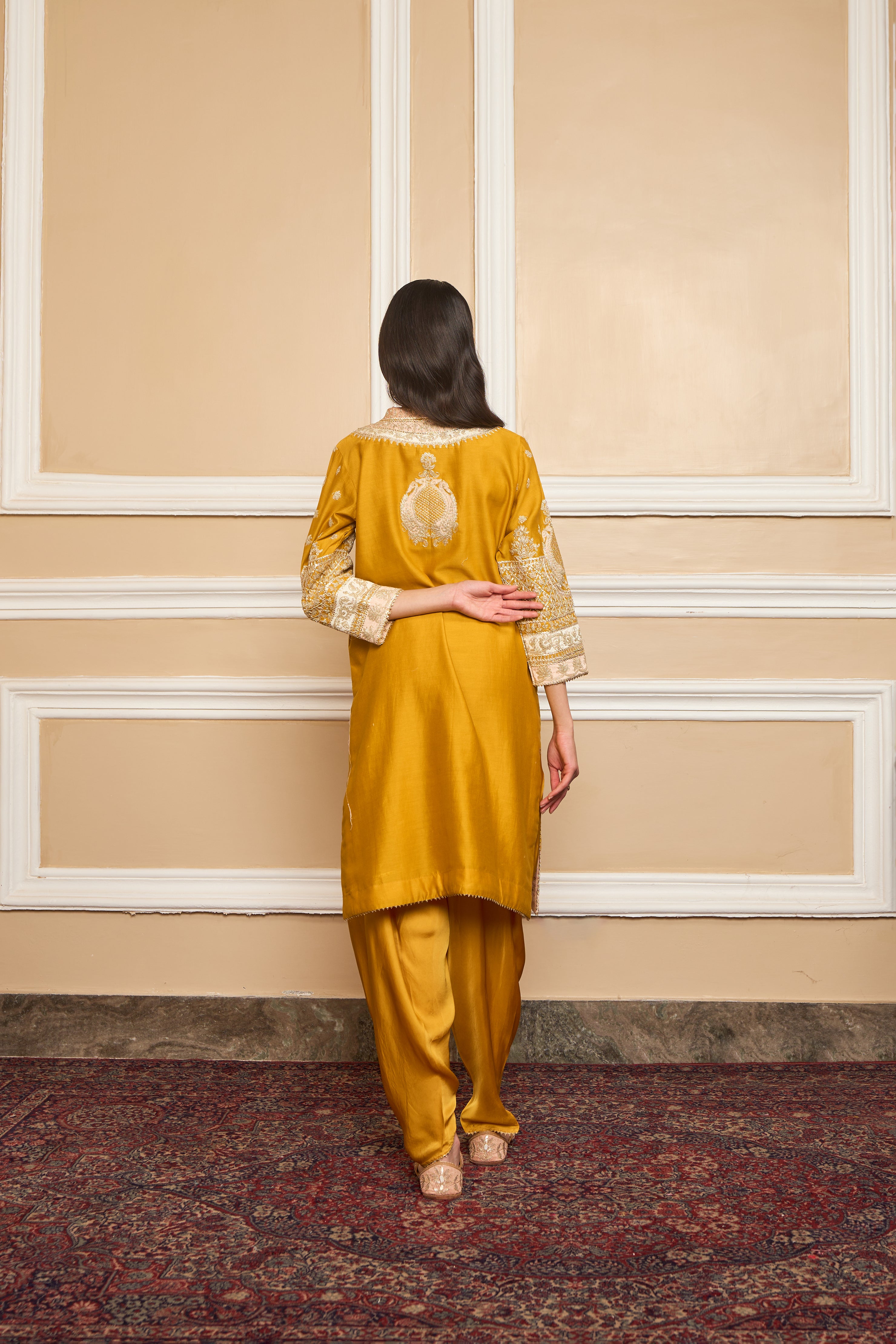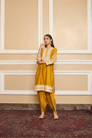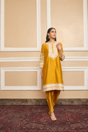 This ensemble is made in pure silk chanderi fabric and adorned with heritage Kashmiri Tilla Embroidery. It features a collar with placket and three-quarter sleeves. The whole ensemble is highlighted with appliqué, gota and is finished using a chanderi silk banarsi fabric.
