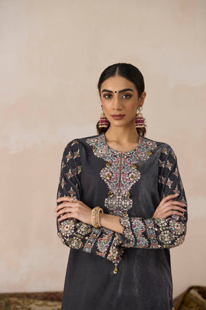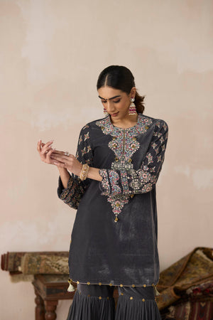 The velvet short kashmiri kurta with embroidered sleeves paired with garara. Features multicoloured thread and gold zari embroidery on the front and sleeves, enhanced with metal sequence, ghungroos and tassels.