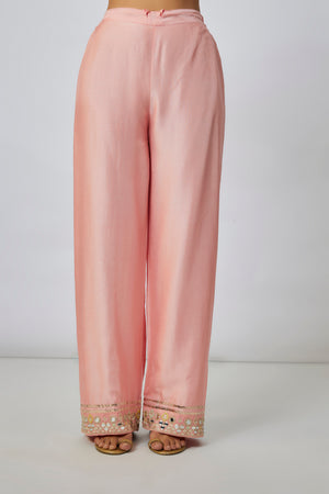 This kurta set features long A-line kurta with scalloped neckline and mirror work on hemline nand cuffs. Paired with straight-fit pants decorated with mirror work on the hem. Completing the look is a dupatta with embroidered border and scattered mirror motifs