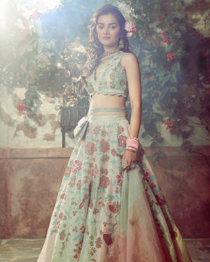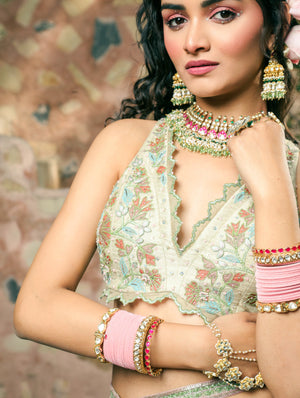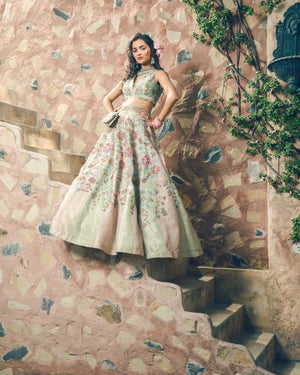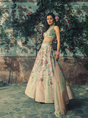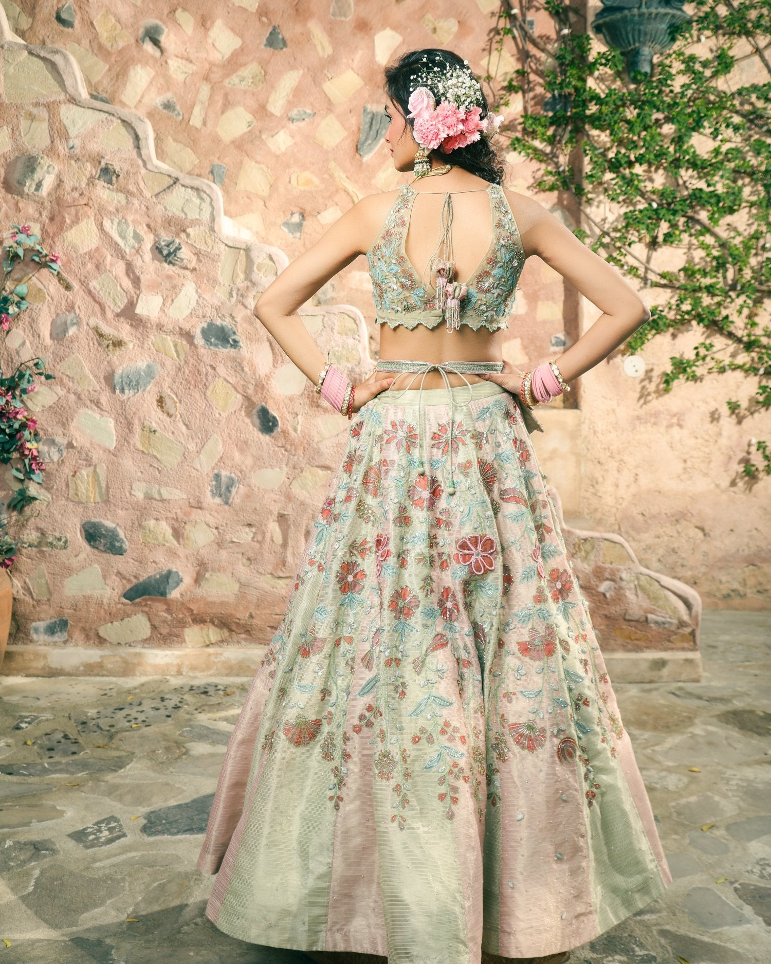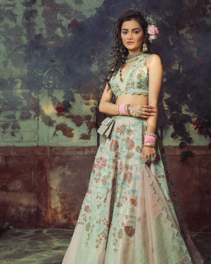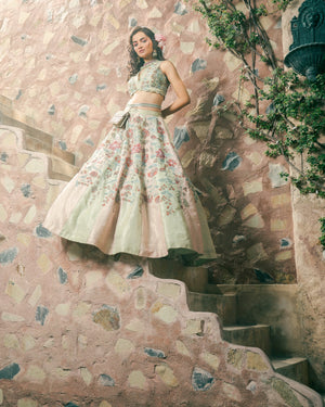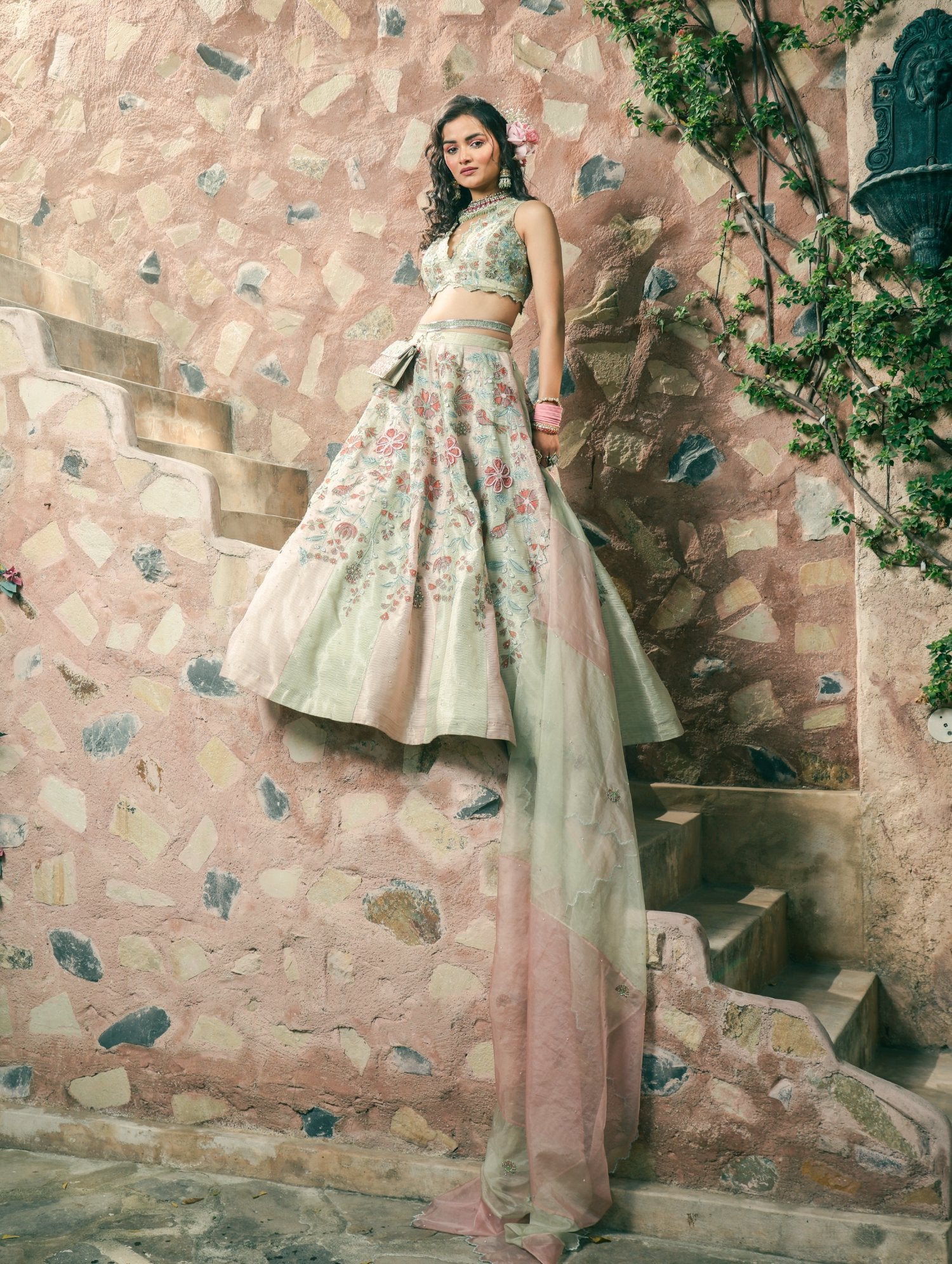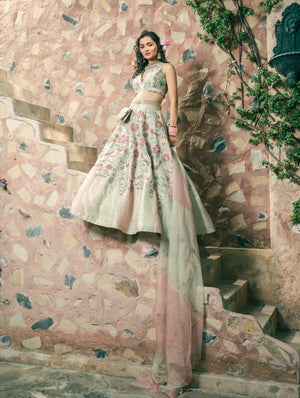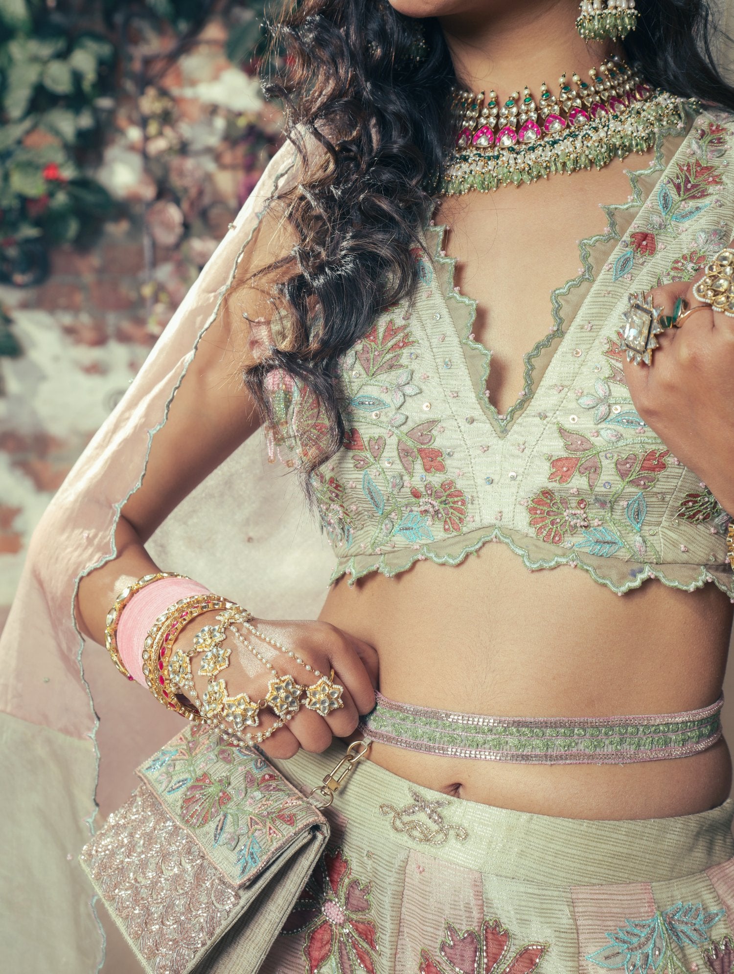 Featuring an Applique, 3-D, Sequins, Cutdana, Badla Dori, Beads and Scallop embroidered Blouse and Lehenga set in Kota Doria base paired with embroidered Organza Dupatta and Kota Doria Belt set