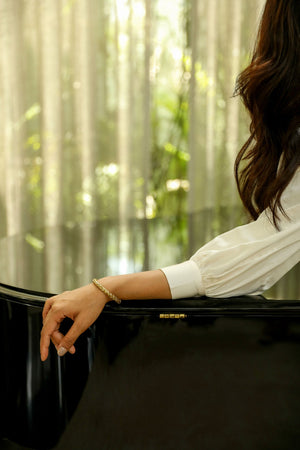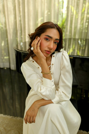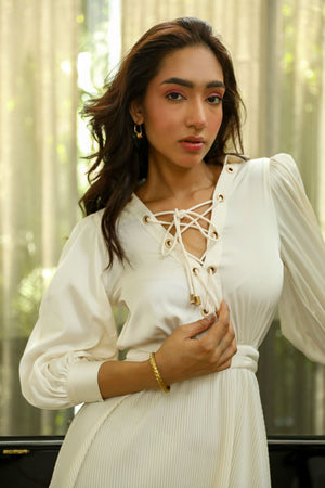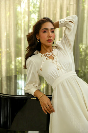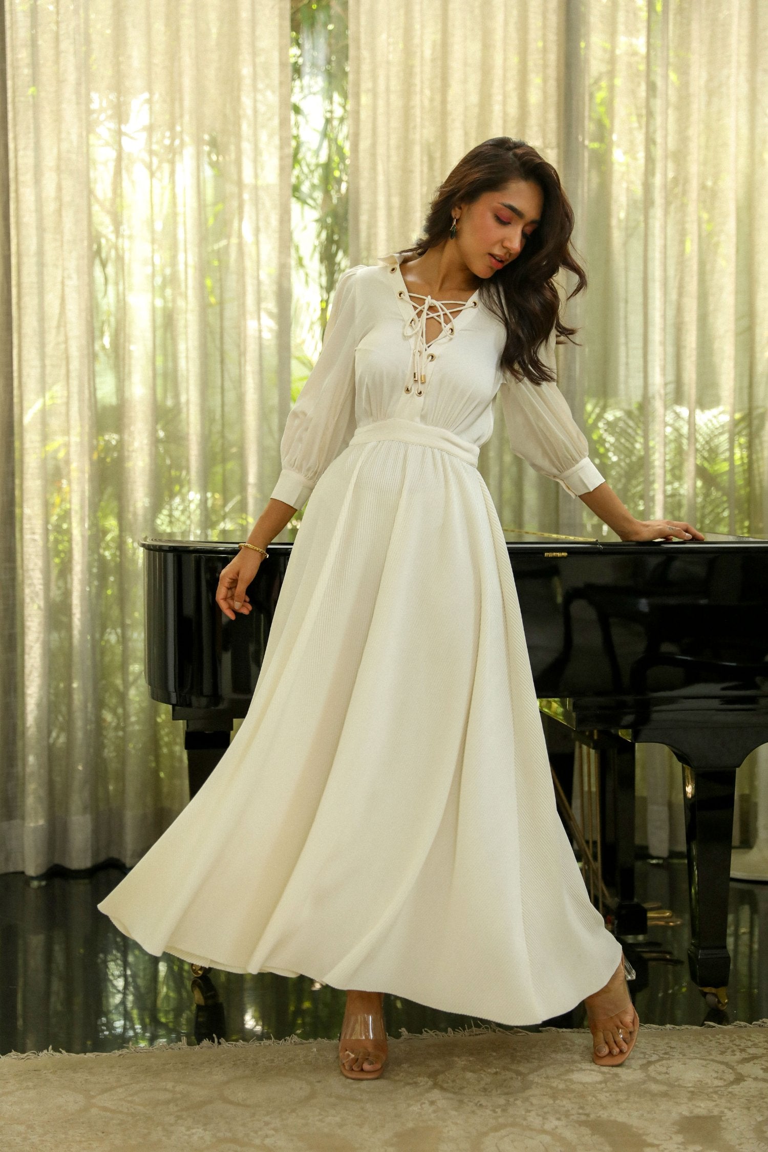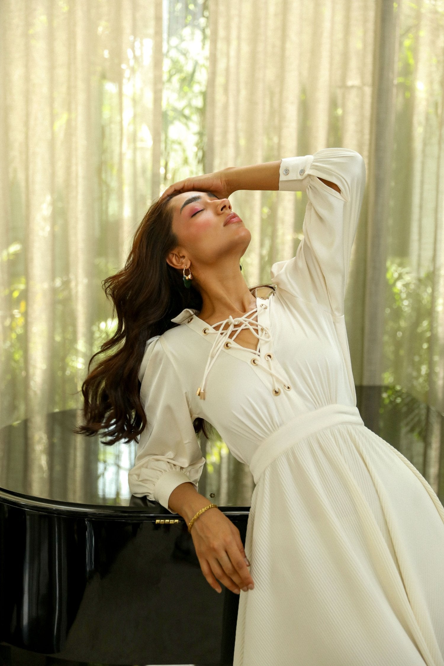 A long white dress with drawstring detailing on the neckline, adding a touch of elegance and versatility to your ensemble.