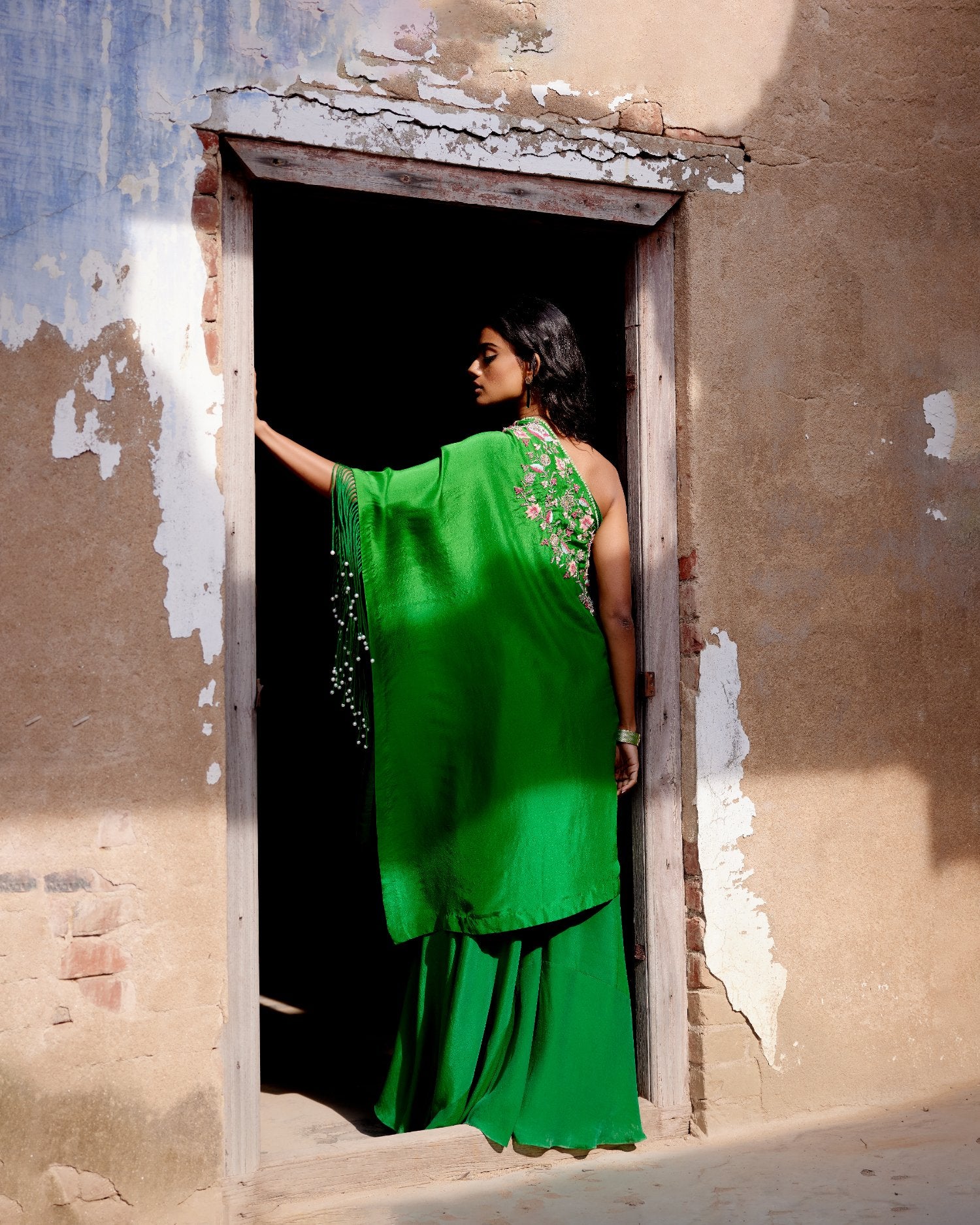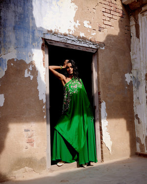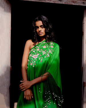 Tassel Detailed One Shoulder Floral Hand Embroidered Silk Drape Styled With Flair Pants