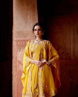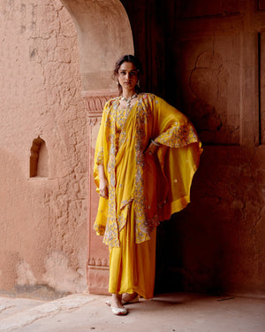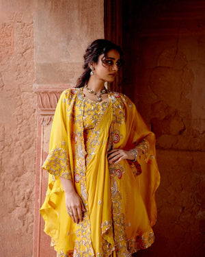Floral Motifs Detailed Hand Embroidered Cape Set With Top ,Skirt & Sash Drape