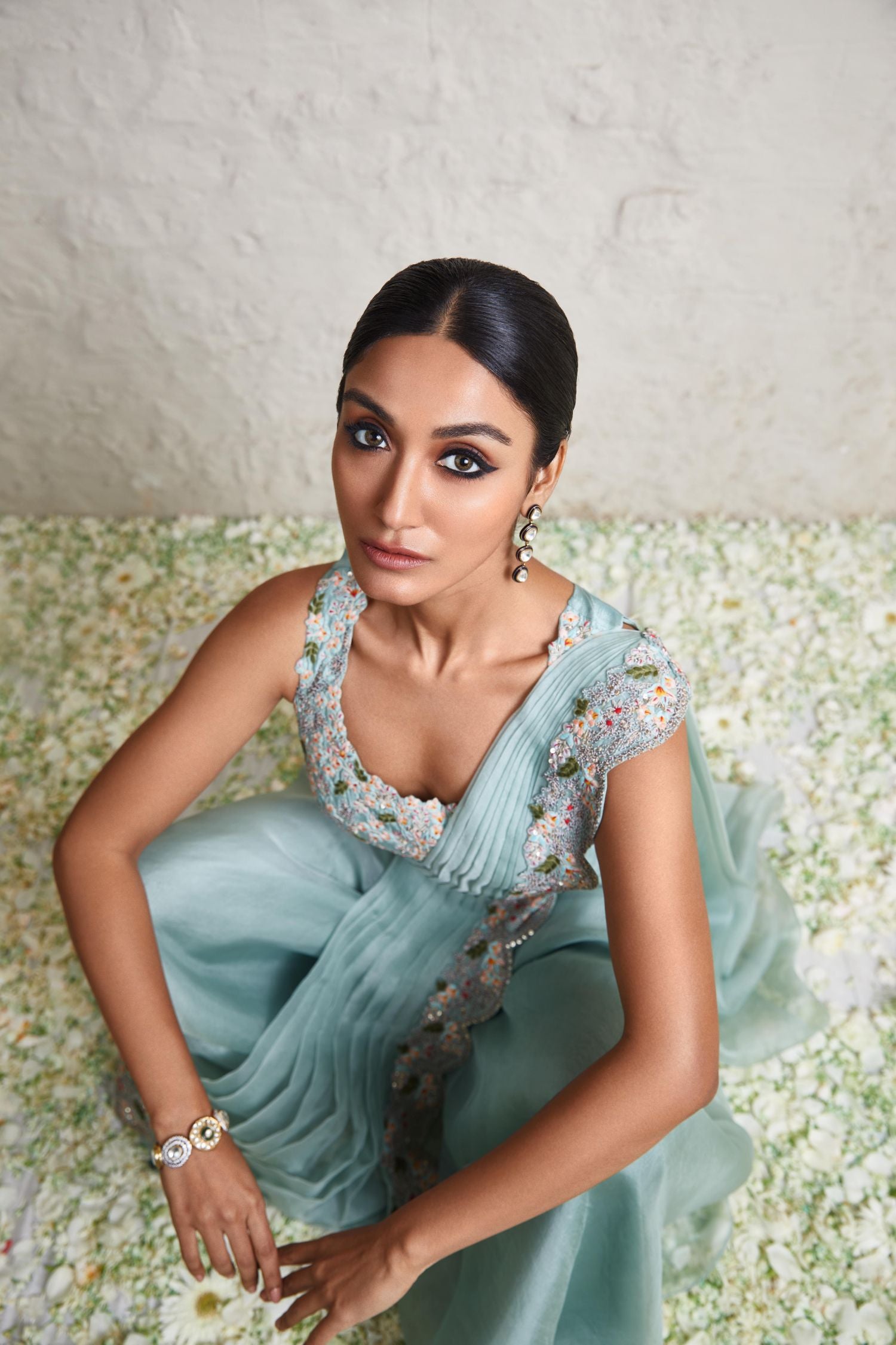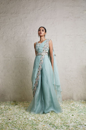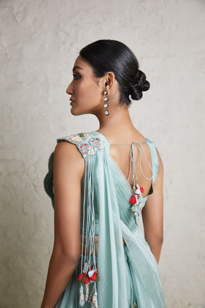 Bustier Paired With Sharara, Drape And Belt With Dori Work Accentuated With Thread Work And Boho Tassels