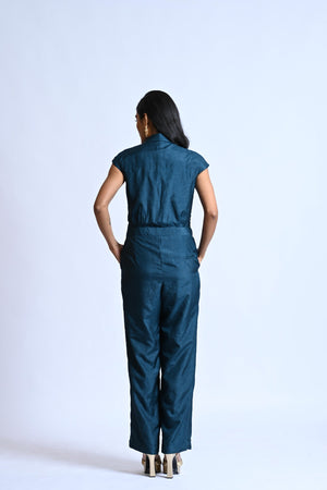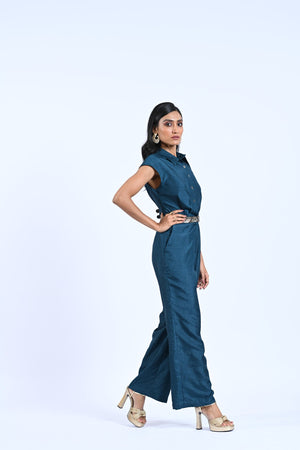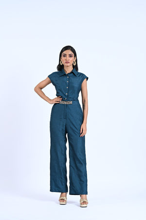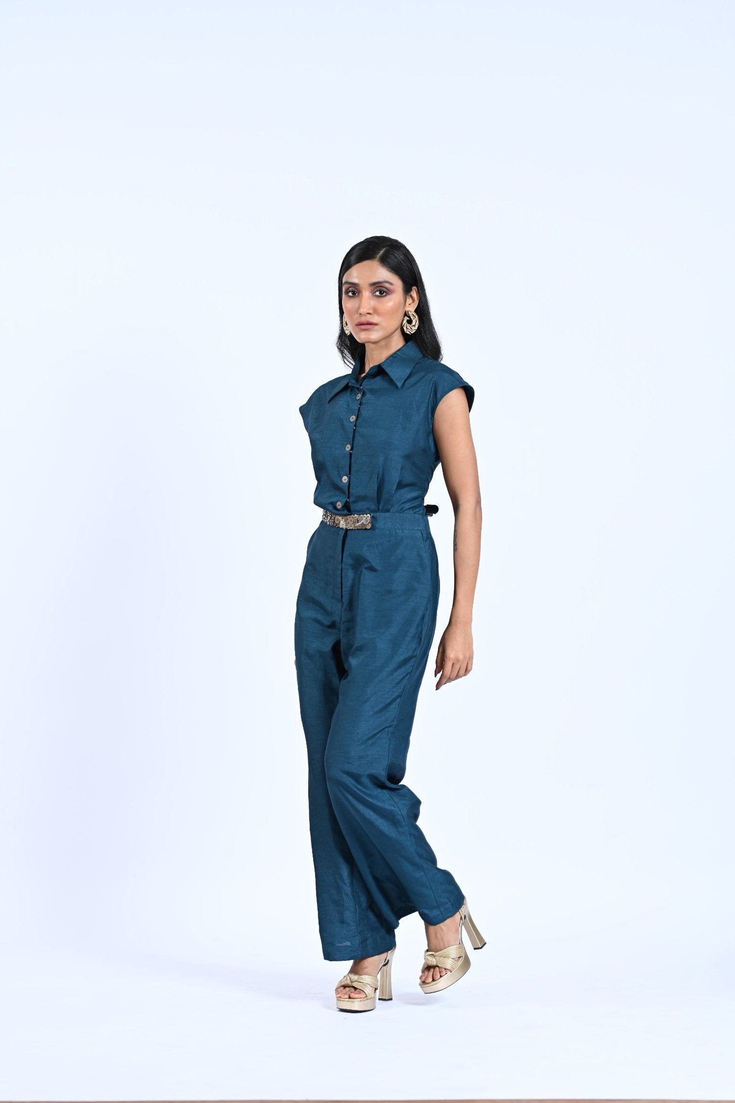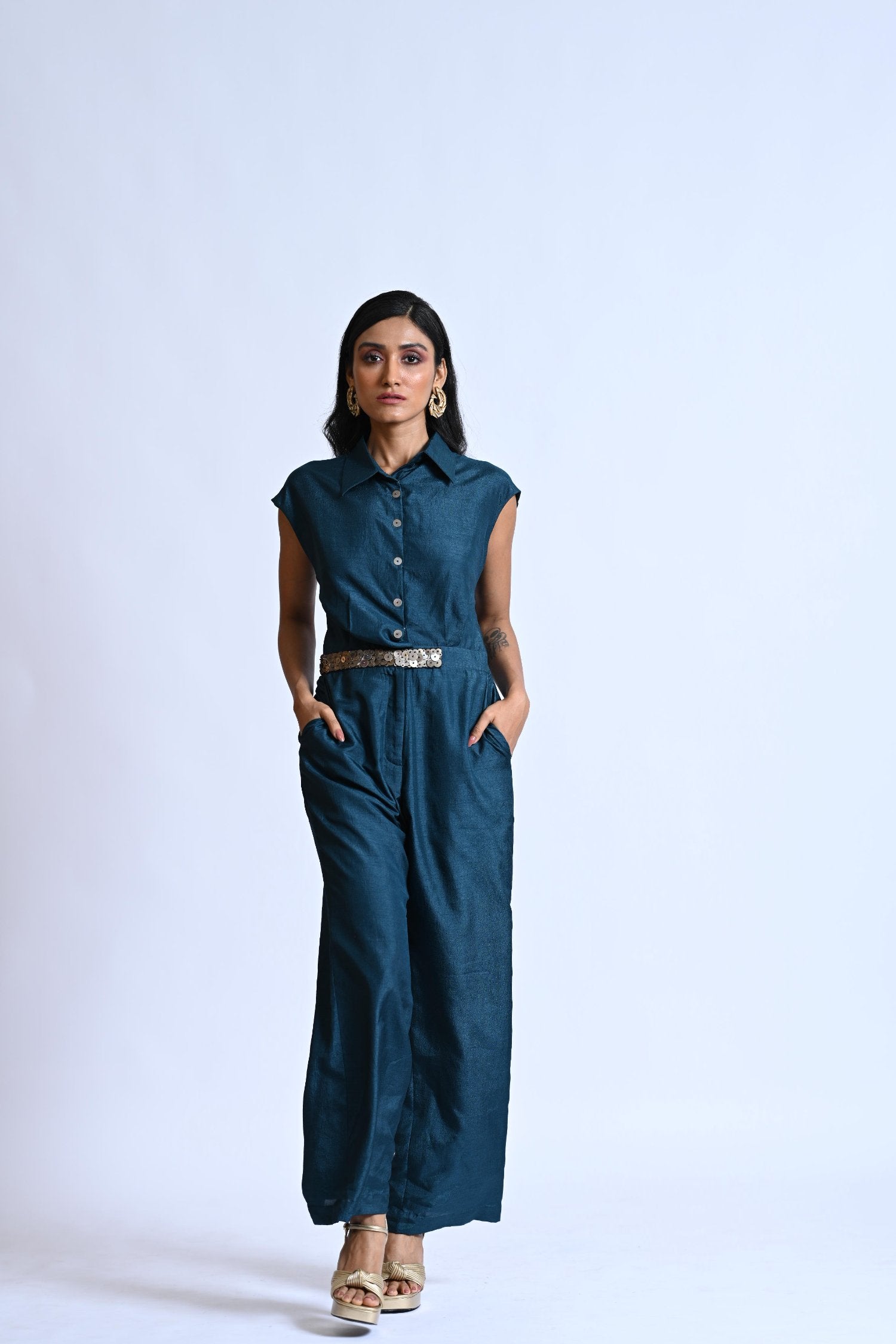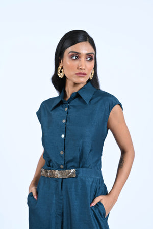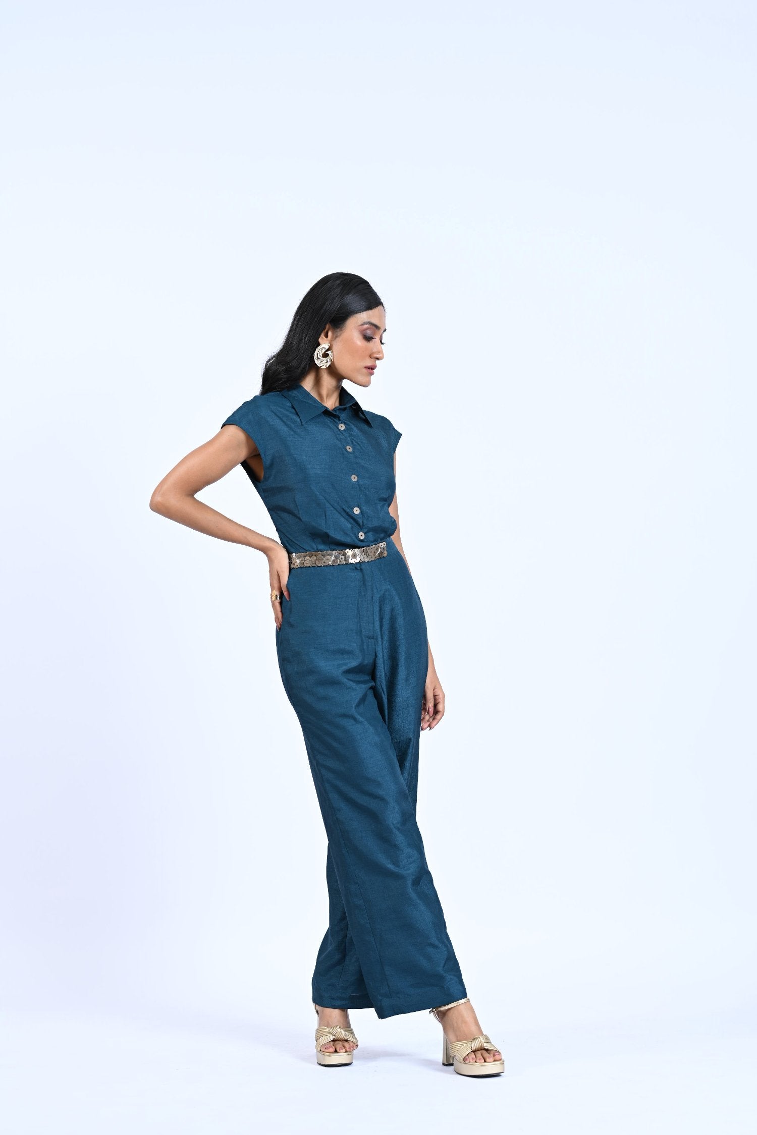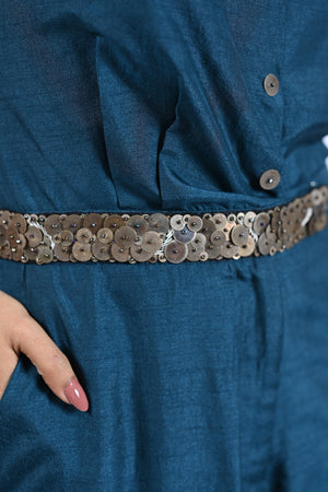 Elevate your wardrobe with Silk Dune - the perfect blend of sophistication and style. This collar buttons jumpsuit features a stunning coin work waist belt, adding a touch of glamour and structure. Embody confidence and elegance with every step in this must-have piece.
