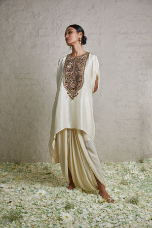 Antifit Kaftaan Paired With Dhoti With Dori Work Accentuated With Threadwork And Boho Tassels