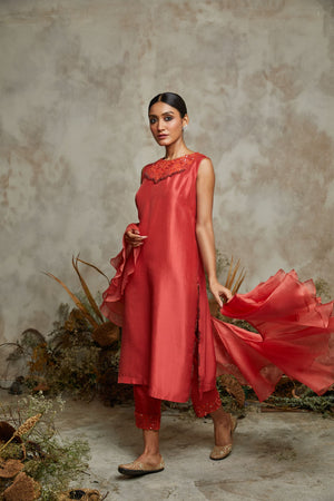 Silk Kurta With Cotton Satan Pants And Organga Ruffle Dupatta