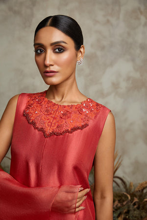 Kurta And Pants With Ruffle Dupatta In Burnt Orange With 3D Organza Flowers Paired With Thread Work And Glass Pearls