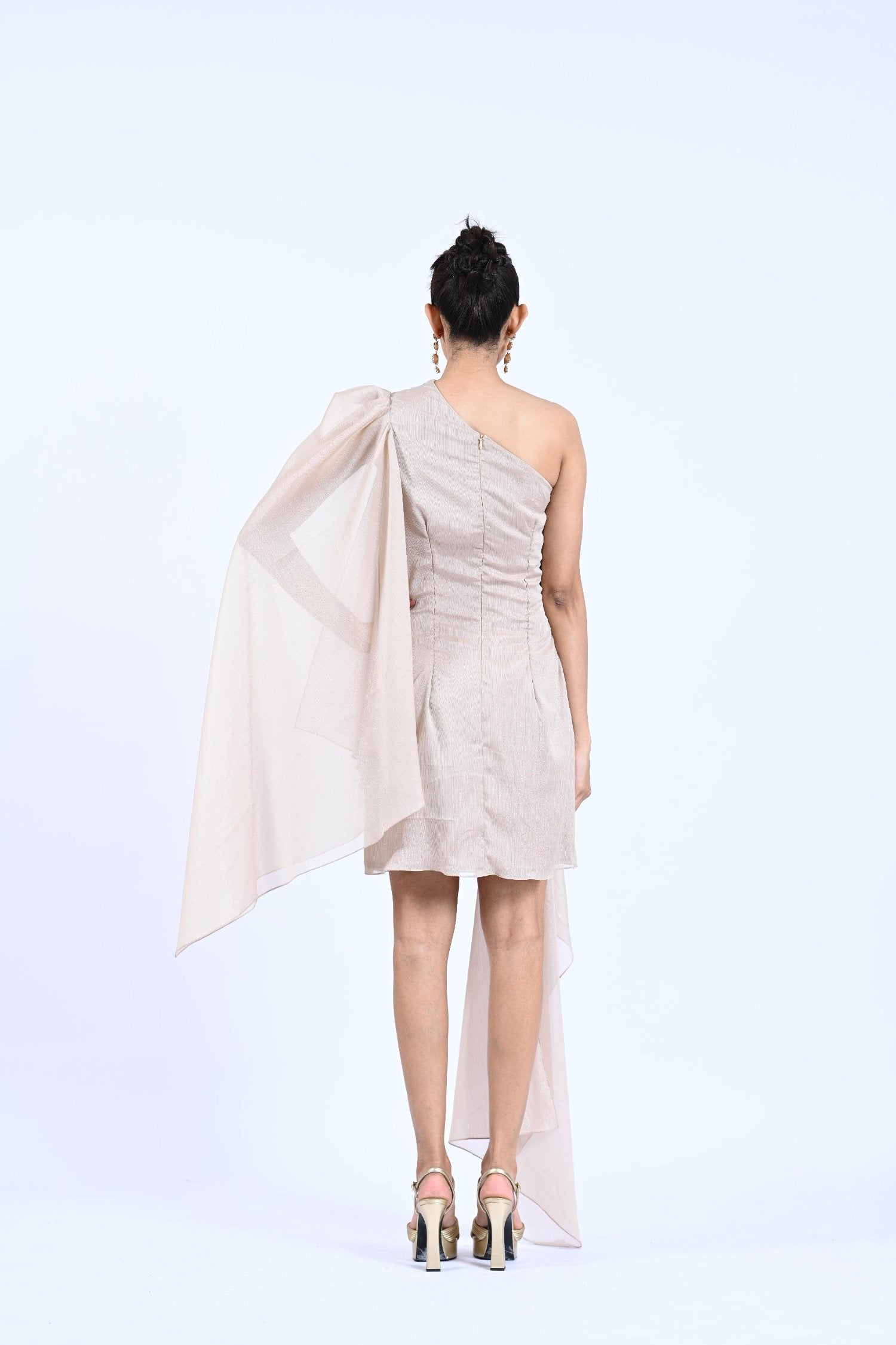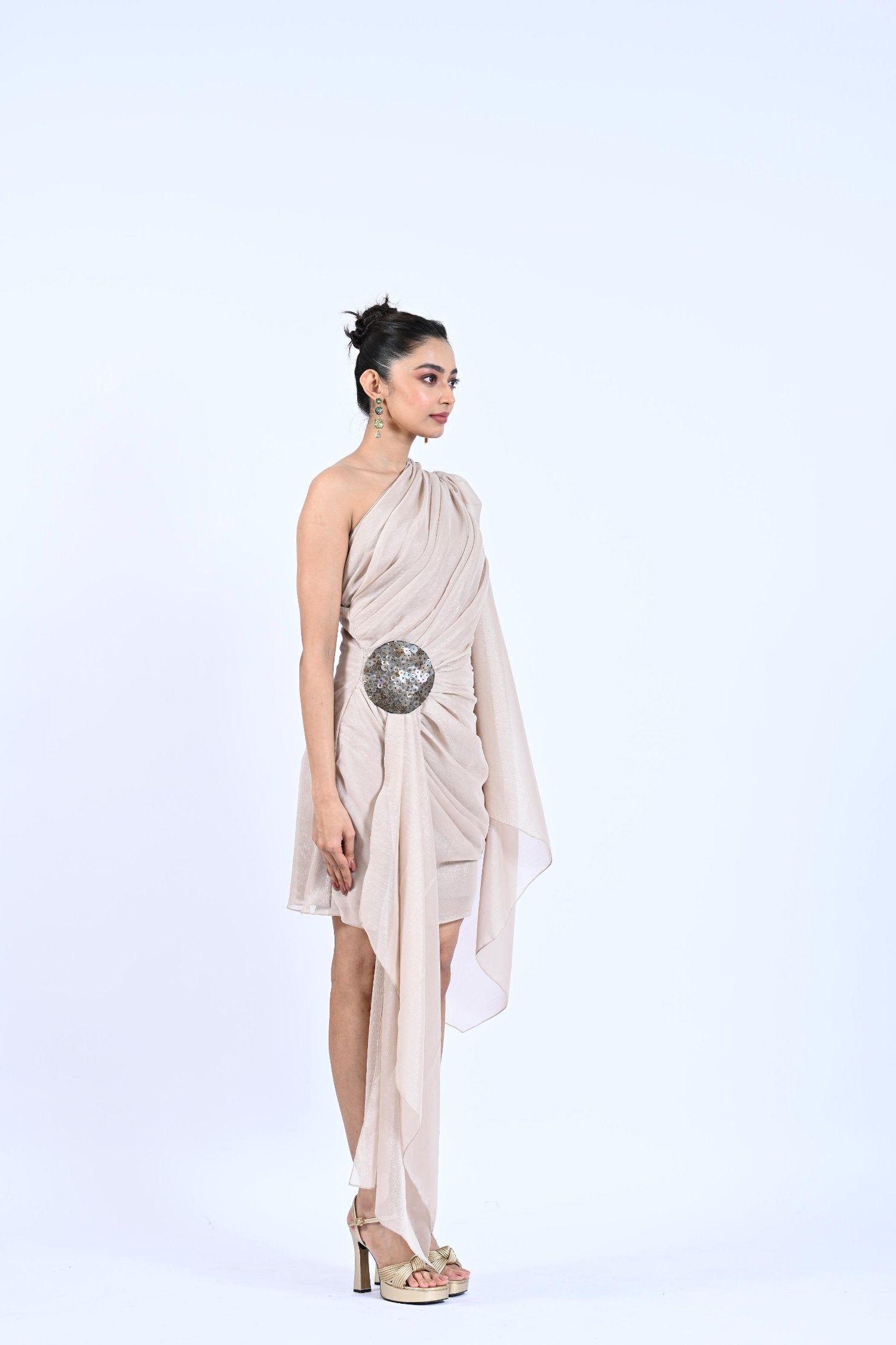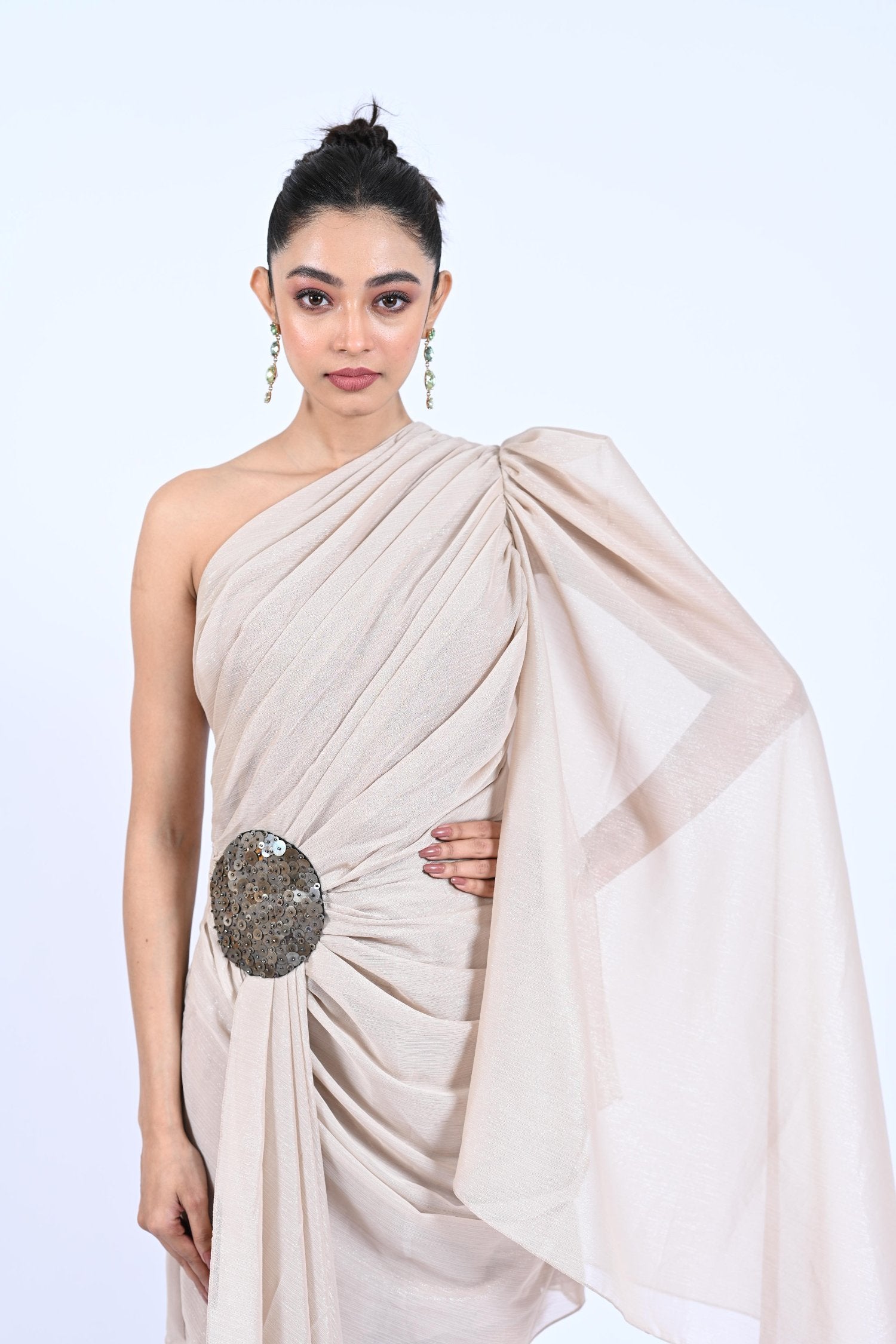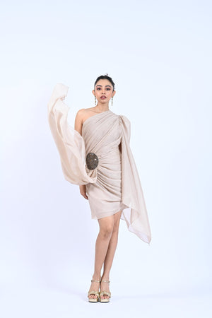 This luxurious Silk Sands dress is perfect for special occasions. The one-shoulder silhouette features flowy sleeves and a shimmer fabric that will make you shine. For a touch of glamour, the circle coin work on the waist adds a unique detail.