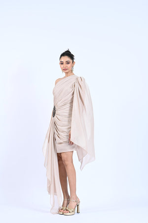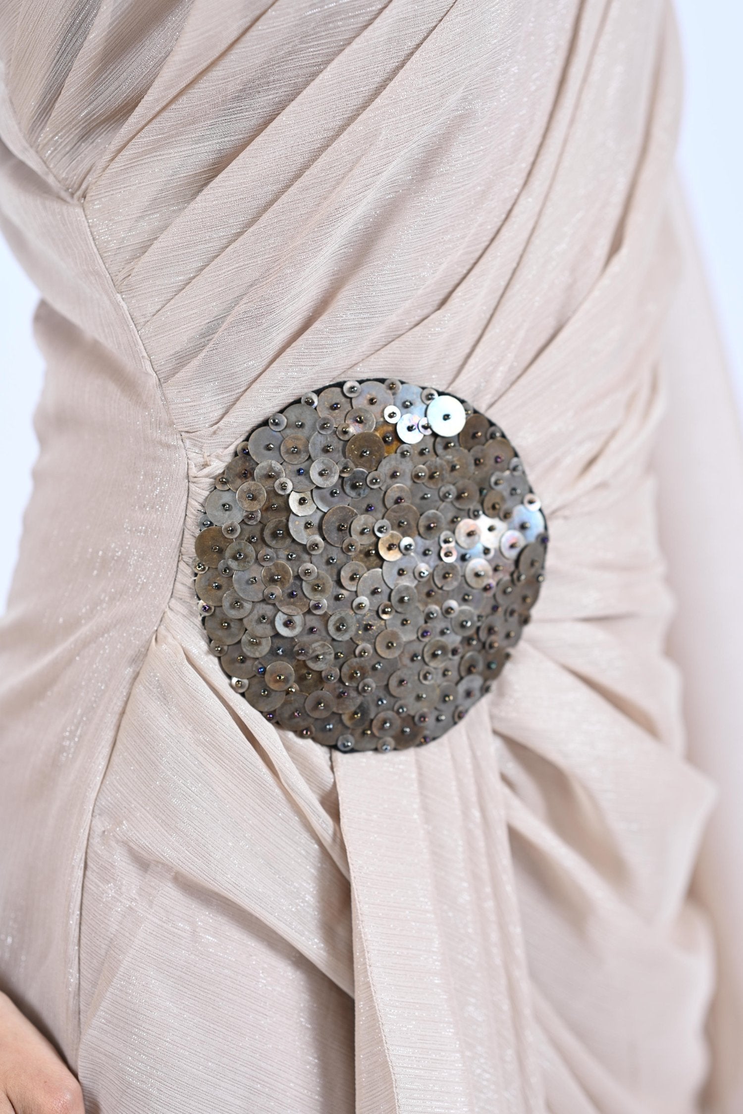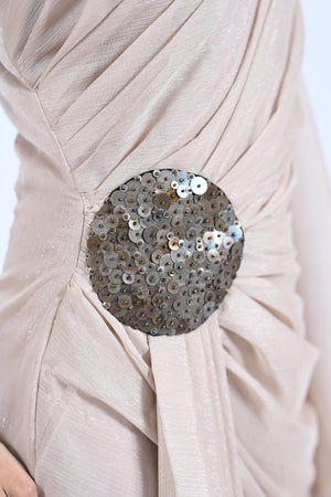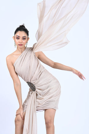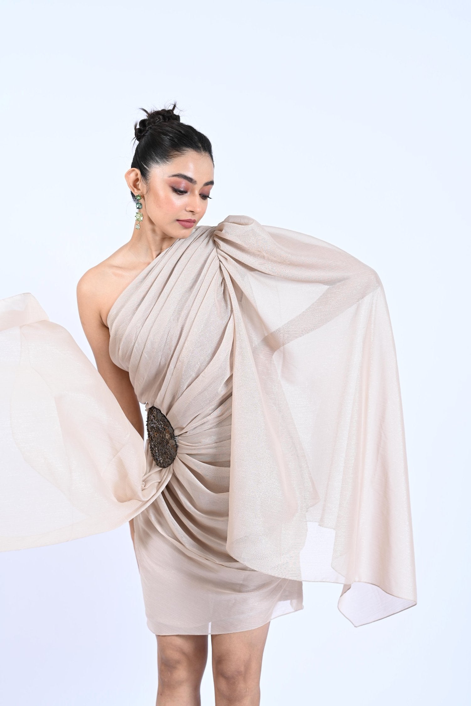 This luxurious Silk Sands dress is perfect for special occasions. The one-shoulder silhouette features flowy sleeves and a shimmer fabric that will make you shine. For a touch of glamour, the circle coin work on the waist adds a unique detail.