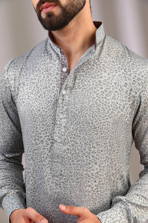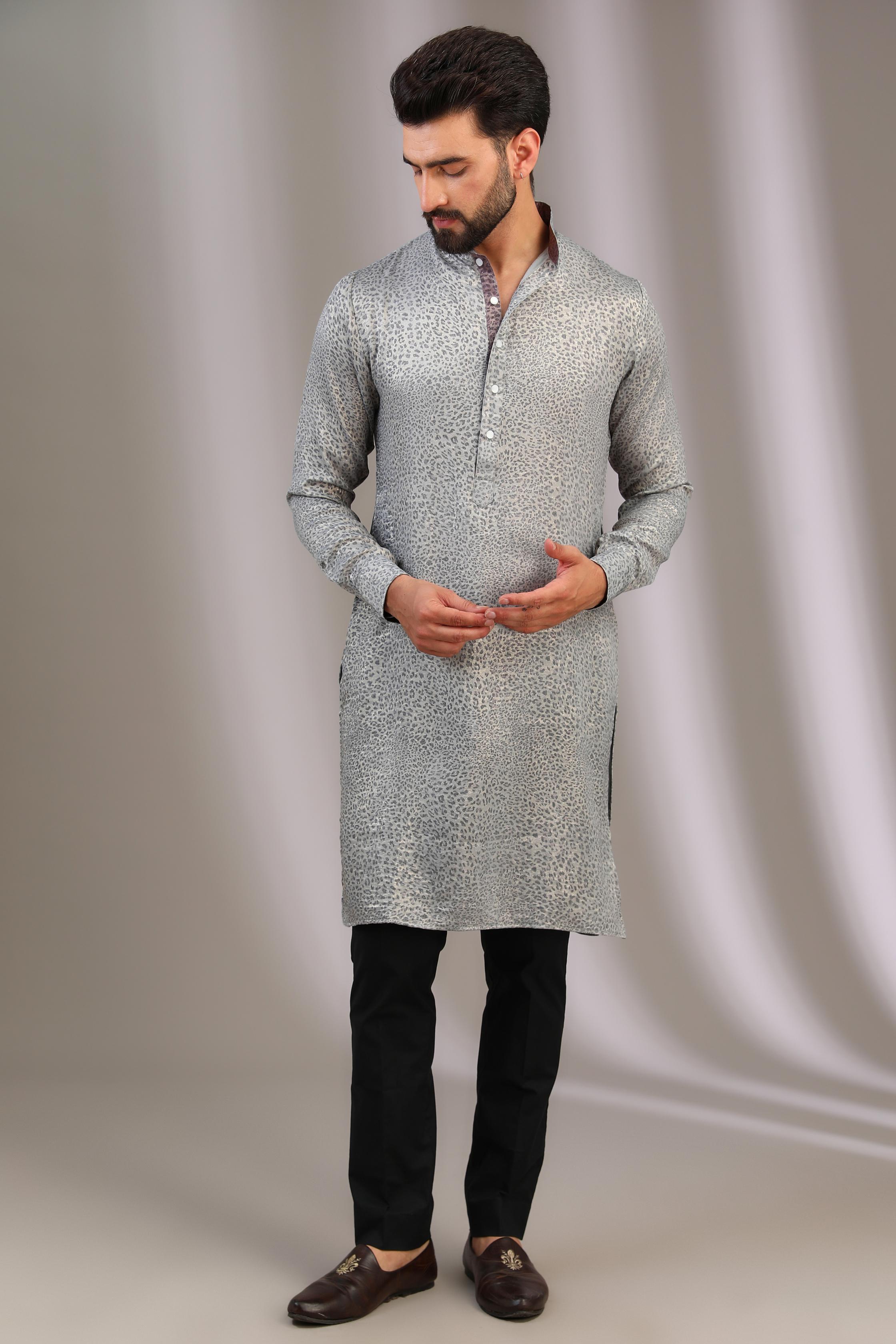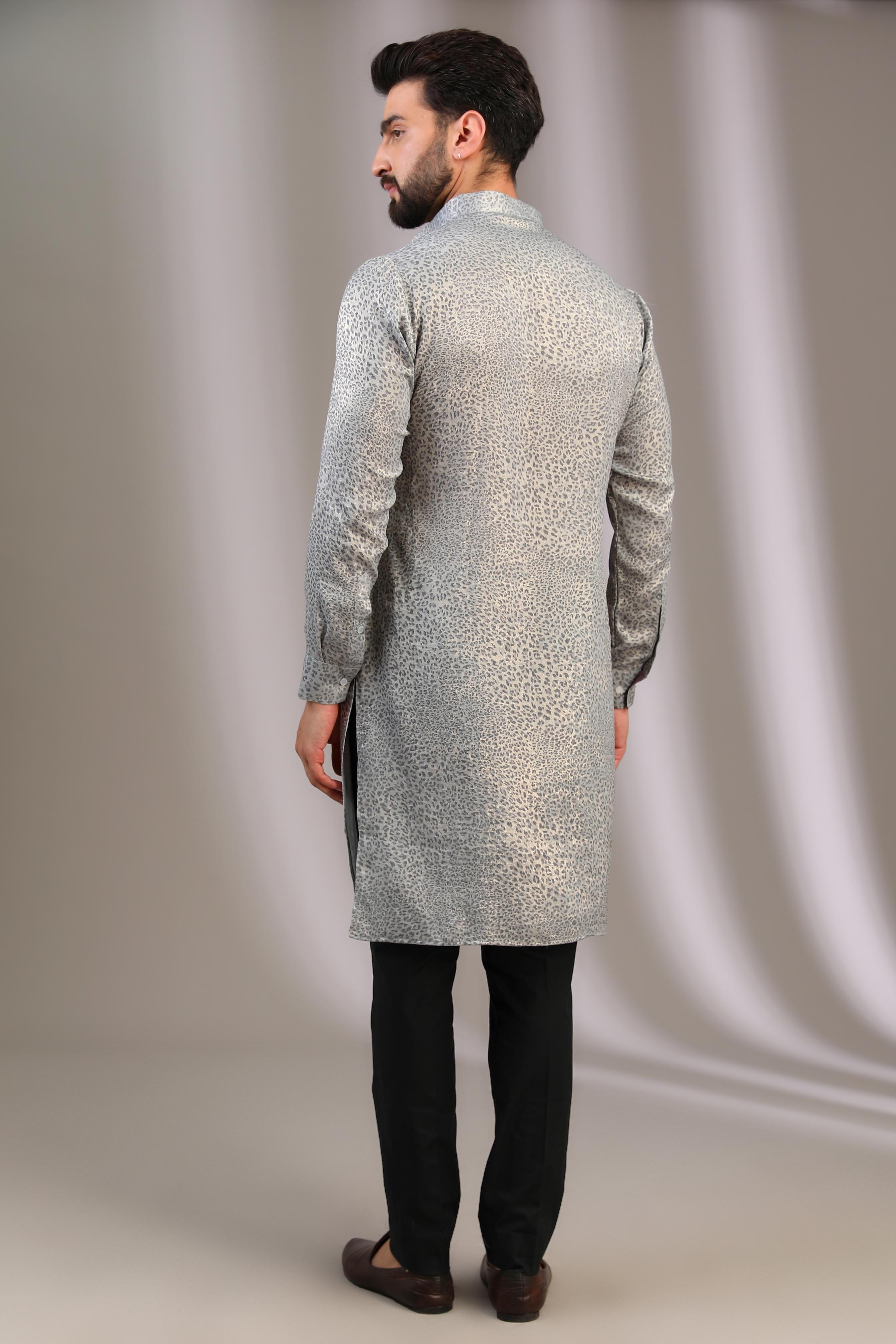 SILVER A.P PRINT SILK UNLINED KURTA W BLACK COTTON PANT