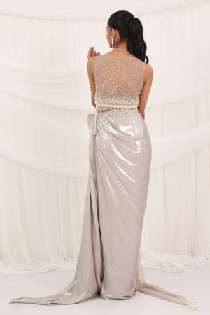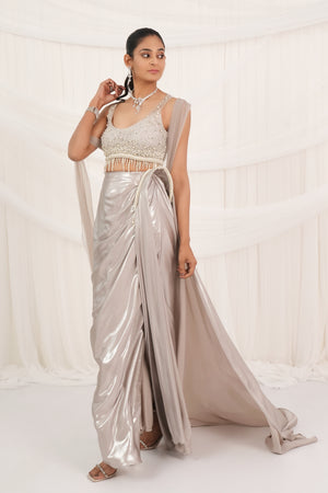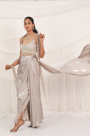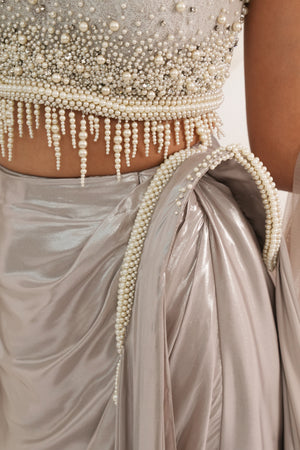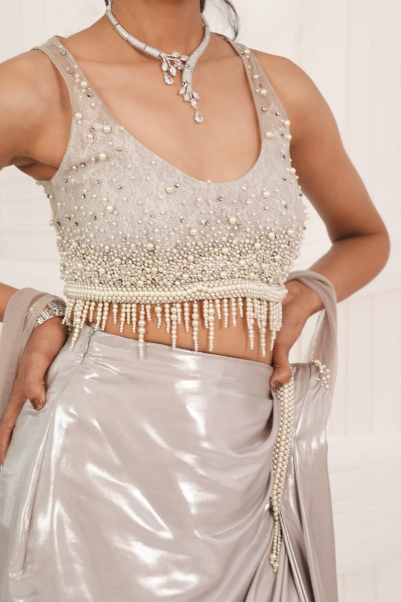 An ivory statement drape featuring graceful gathers and a chic side slit, paired with an elegant blouse adorned with pearl gradient embroidery and delicate tassels at the edges. This ensemble blends timeless sophistication with modern charm.