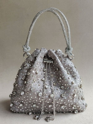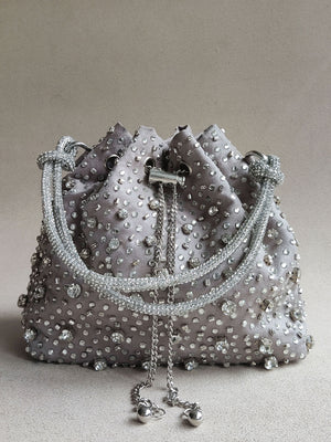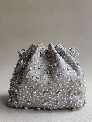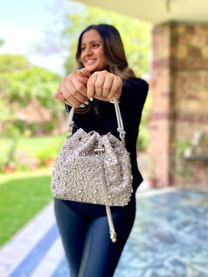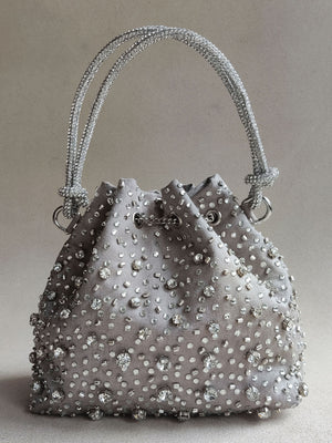 Silver Grey Hand Embellished Bucket Bag in 100% Vegan Suede featuring a Rhinestone Handle.